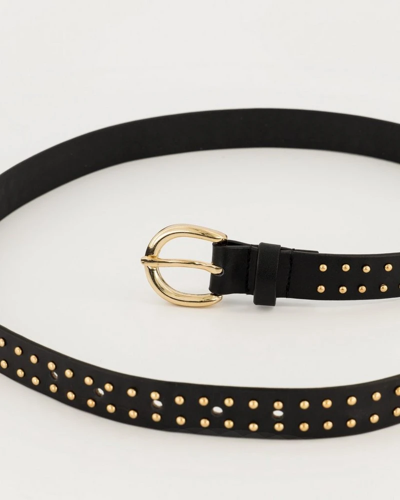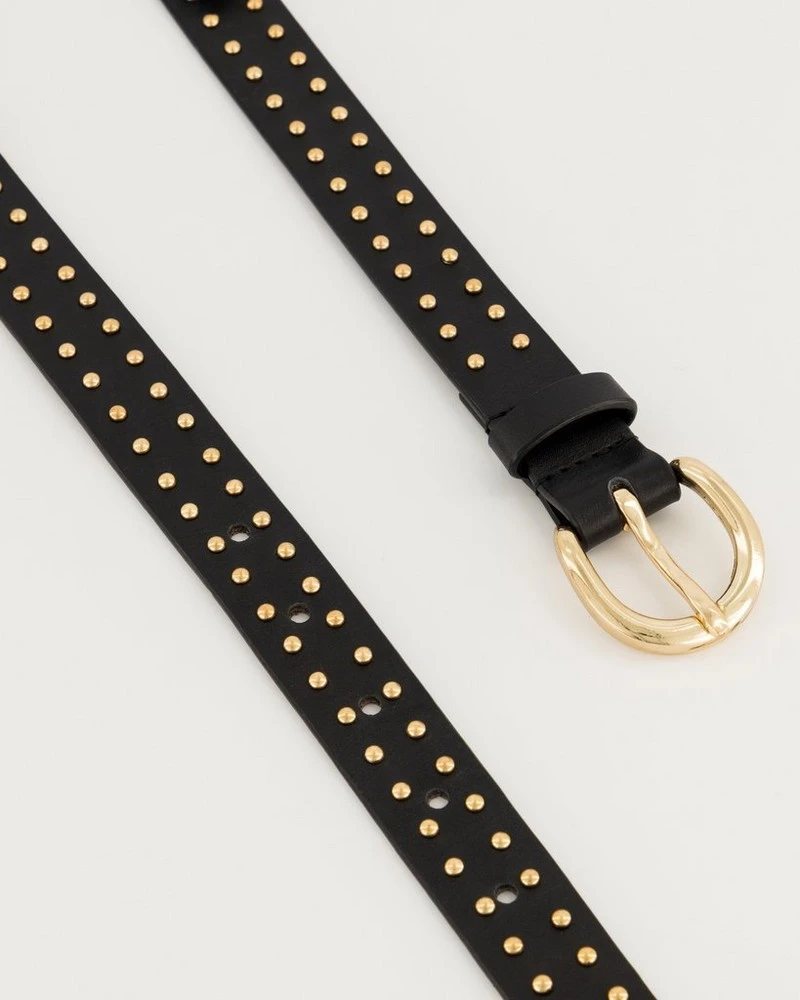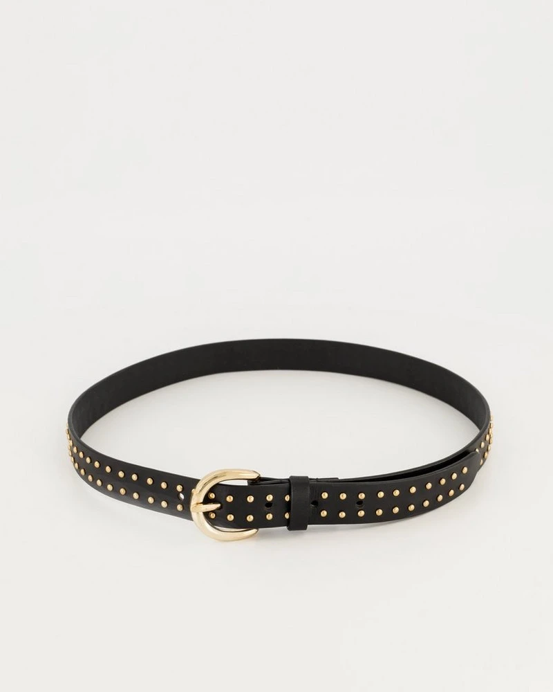 Embrace your inner rocker with the Aelia Studded Belt. Made from leather, this belt features gold studs and a gold buckle that gives it that chic and classic look.