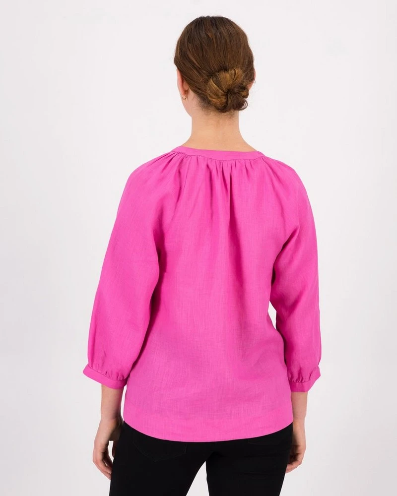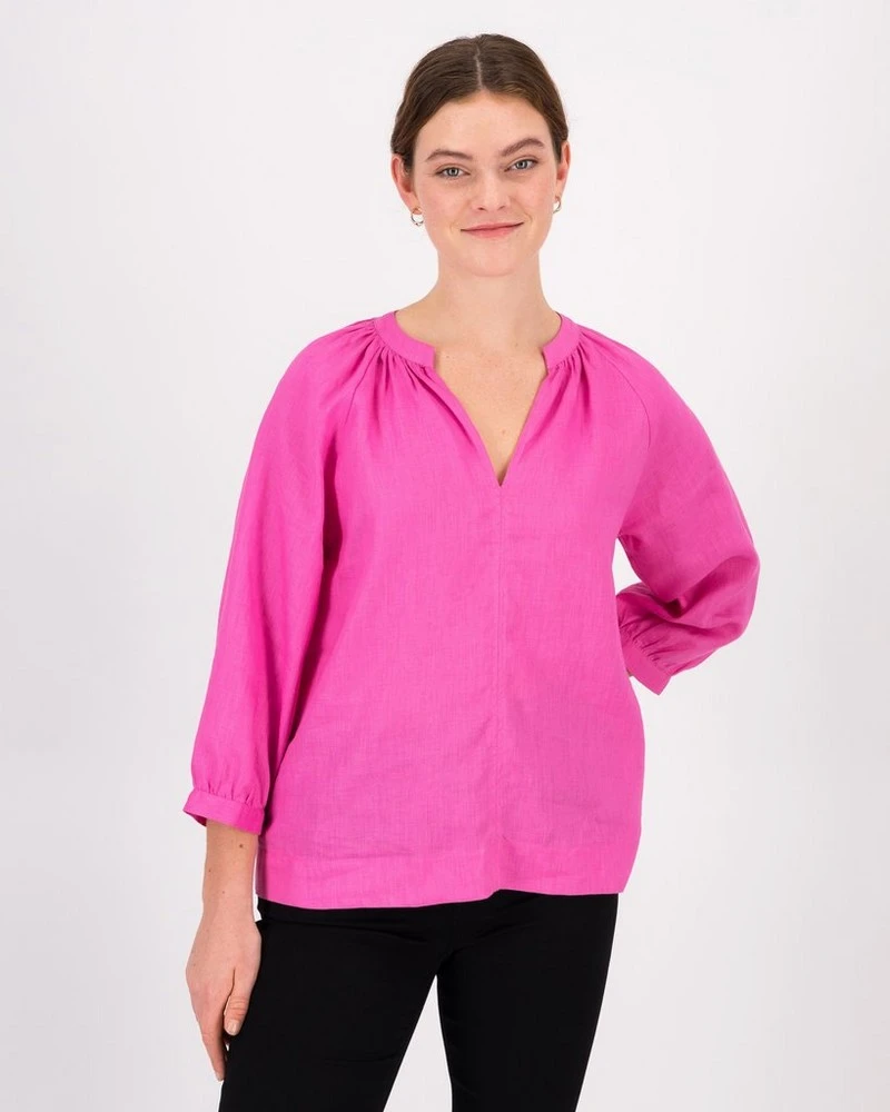 Cool, breathable and feminine, the Amal Linen Blouse is a must-have for the season. Locally made from linen with a relaxed v-neckline, ¾ raglan sleeves and a loose fit, the soft popover is versatile enough for a day in the office, brunch with the girls or summer fun with the family.