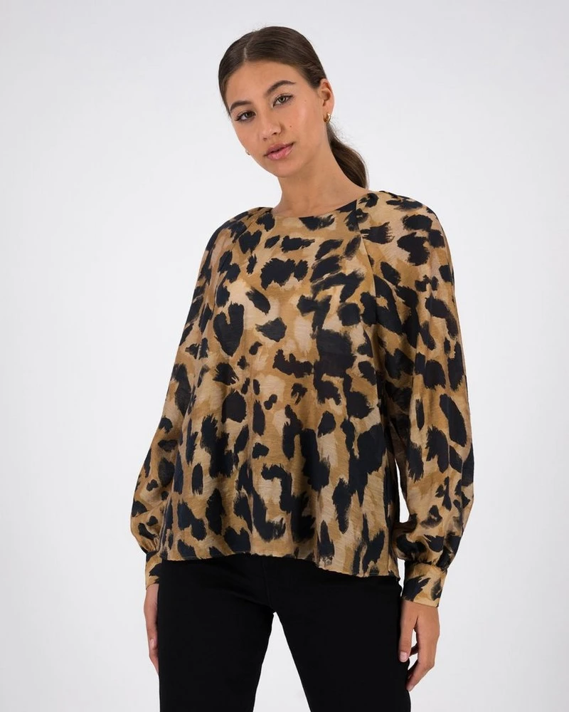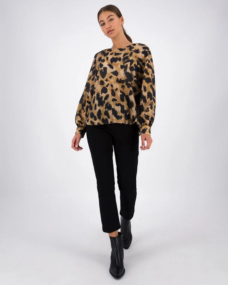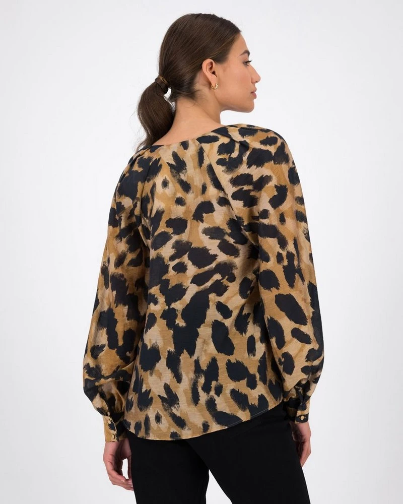 Stay wild with the Angel Animal Print Blouse. Locally made from a luxe tencel blend fabric, the top features a high neckline and balloon sleeves that create a flattering silhouette.Â