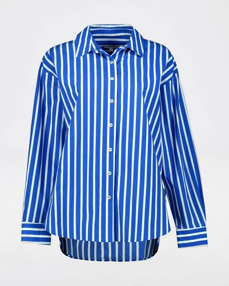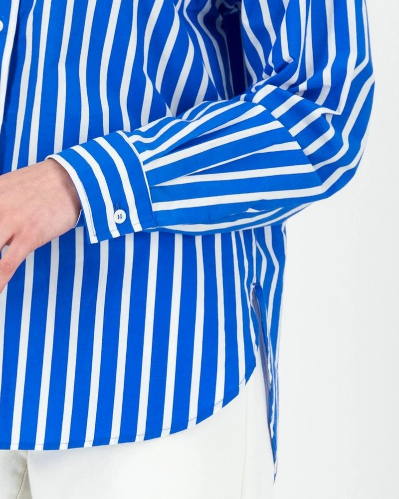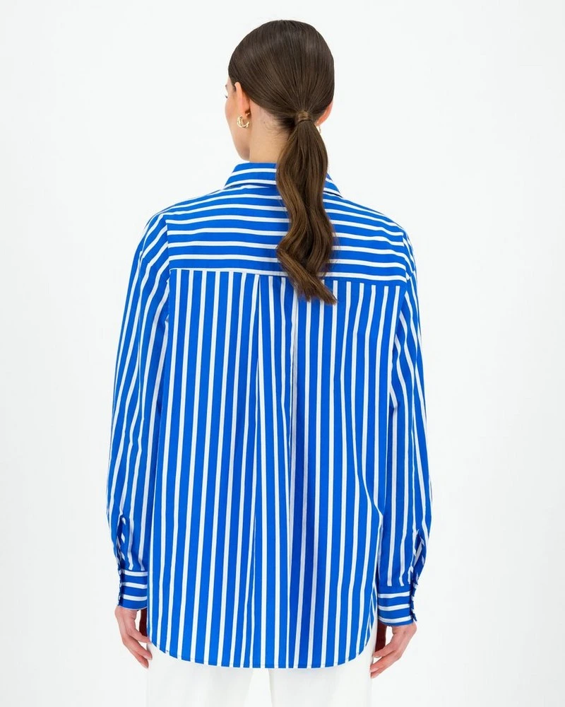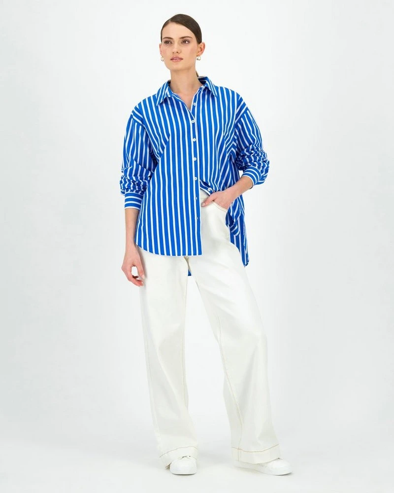Structured, tailored, and versatile, the Annalise Relaxed Shirt can be dressed up or down. Locally made from sustainably sourced cotton with a striped print and pop of colour, it features a classic collared neckline with a full-length button-down, long button-cuffed sleeves and side slits for ease of movement.