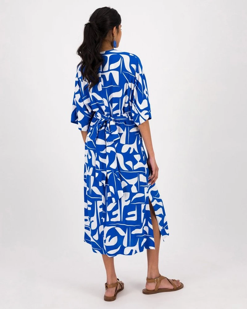 Laidback and luxe, the Asanda Dress is a summer must-have for the Poetry woman. Locally made from a lightweight plant-based viscose blend with a pop of print, the midi dress features a fit-and-flare design with a flattering v-neckline, kimono-style sleeves, and gathered detailing at the waist with a matching waist-tie that wraps around the back giving you a cinched-in silhouette.