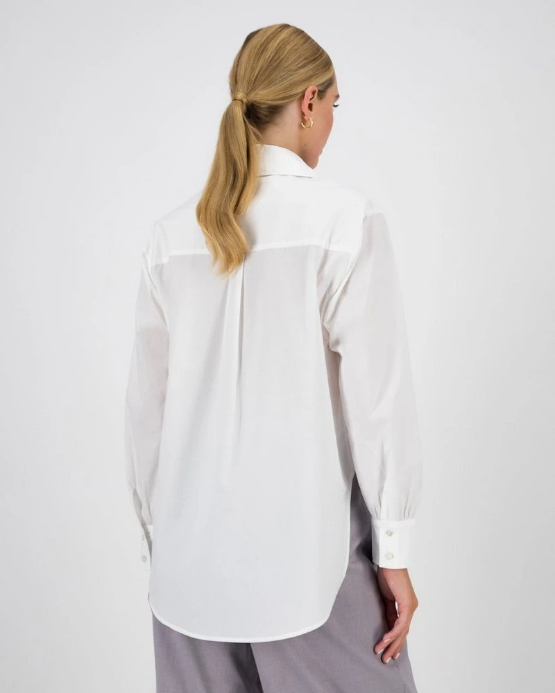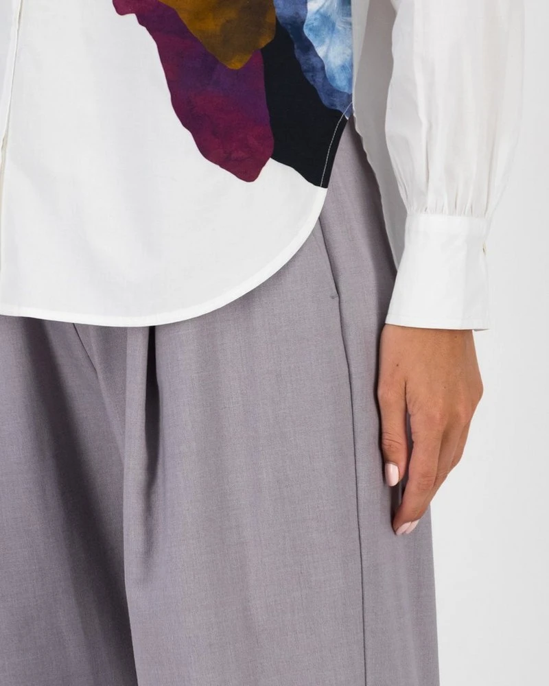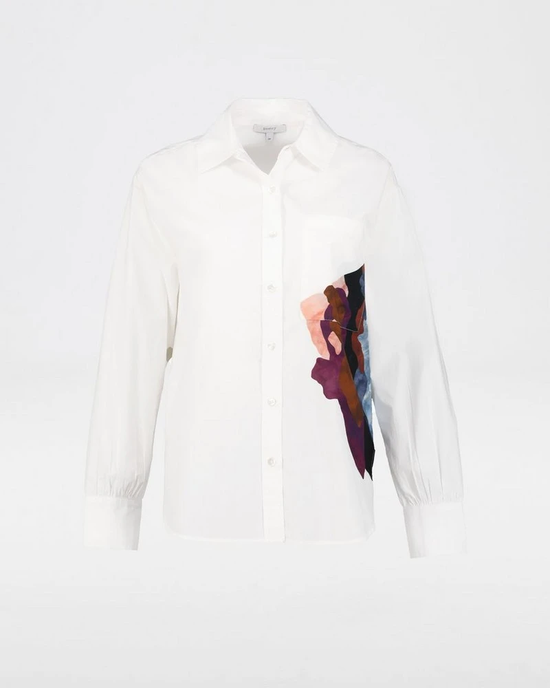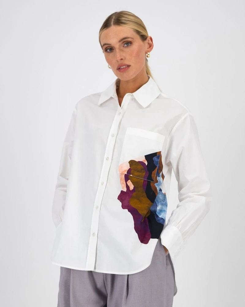 The classic white shirt got an upgrade! The Astrid Print Detail Shirt features a stunning abstract print along one side of the piece that introduces warm tones to your look. Made from crisp cotton fabric, it’s a must-have in your wardrobe.Â