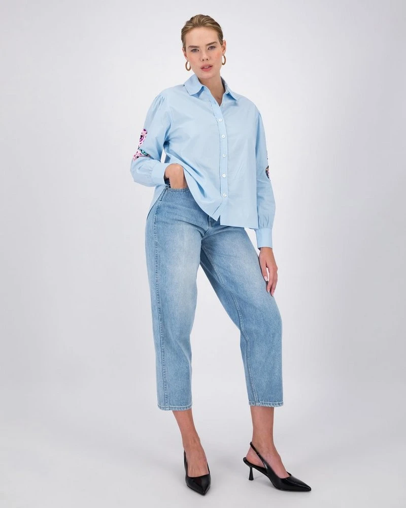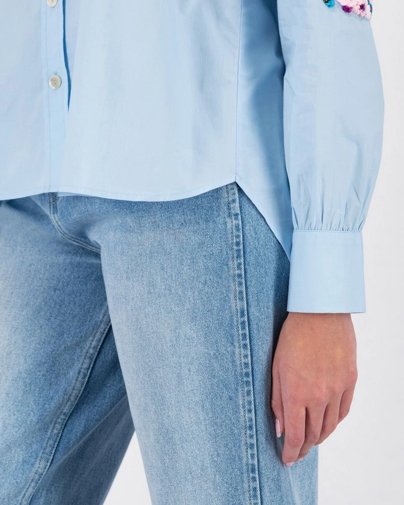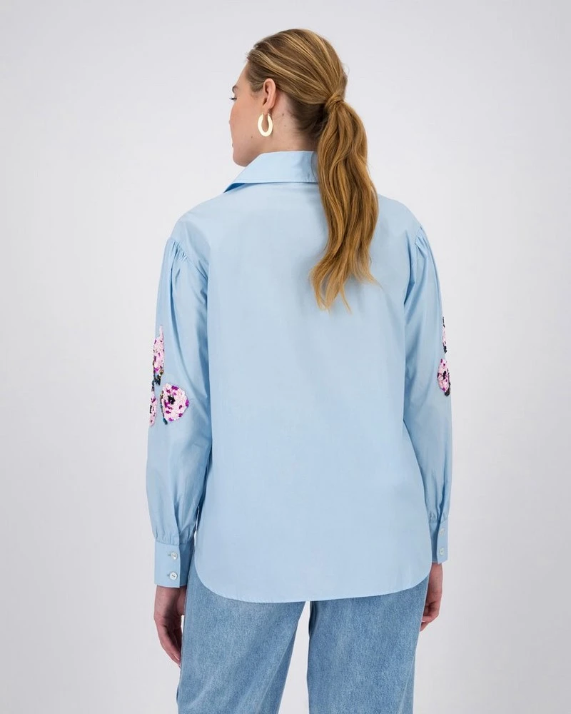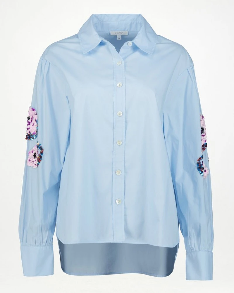 The Aurielle Sequin Shirt lends a subtle touch of glitz to your wardrobe. With the sequined floral applique on the sleeves, the classic cotton shirt is elevated to a whole new level. Dress it up or down, the styling options are endless!Â
