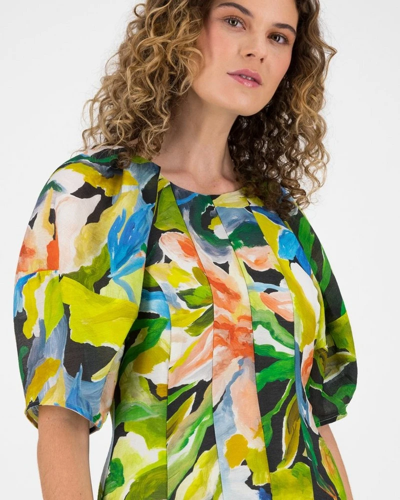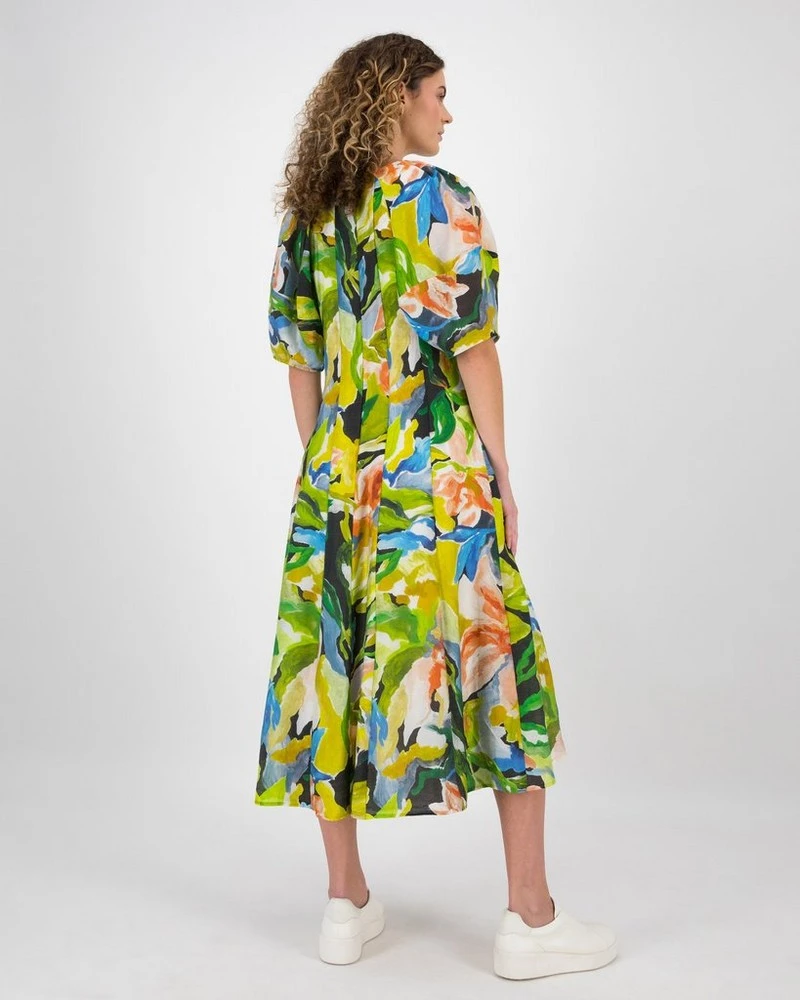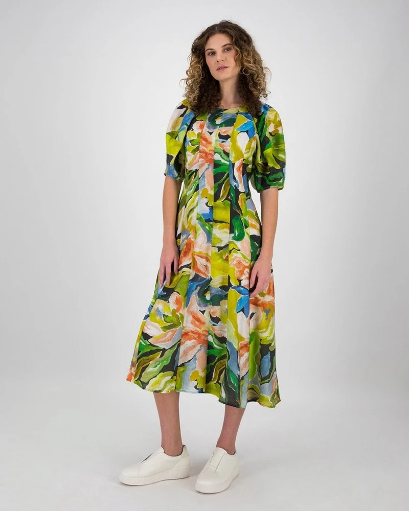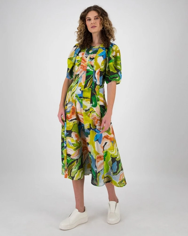 Dress to impress in the Bay Floral Dress. Made locally from a stunning tencel blend fabric, it features panels throughout that create a beautiful flare, accentuated with a vibrant floral throughout. The design is also a Poetry exclusive, designed especially for you.