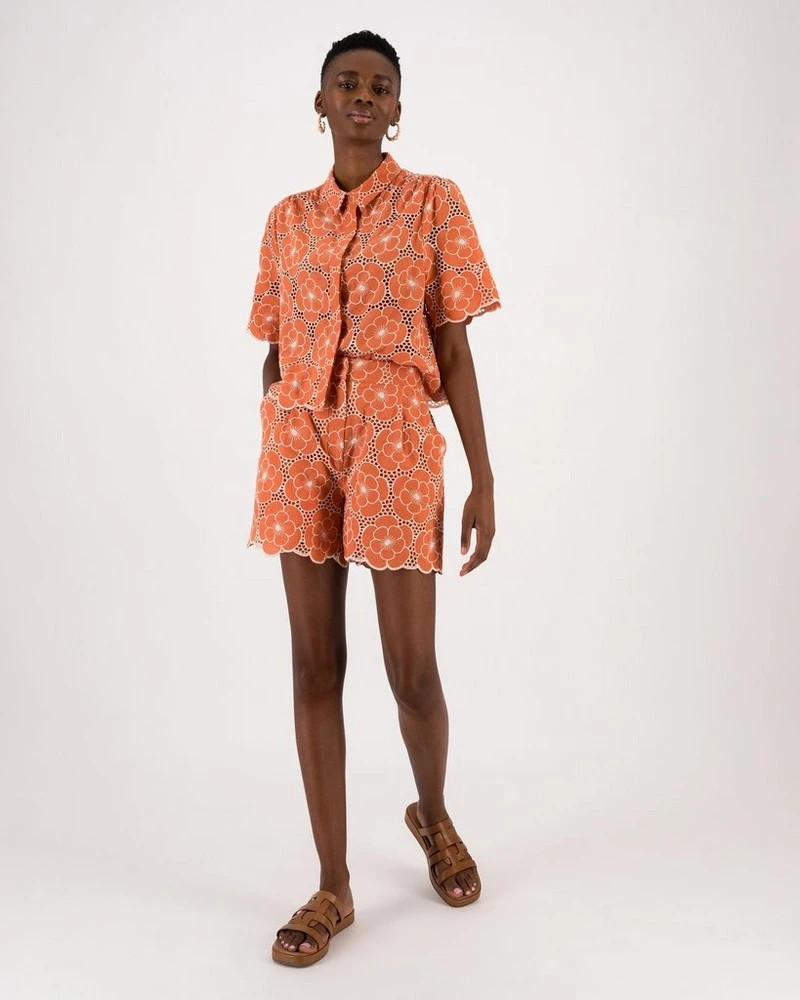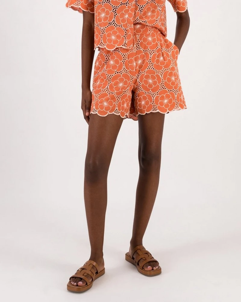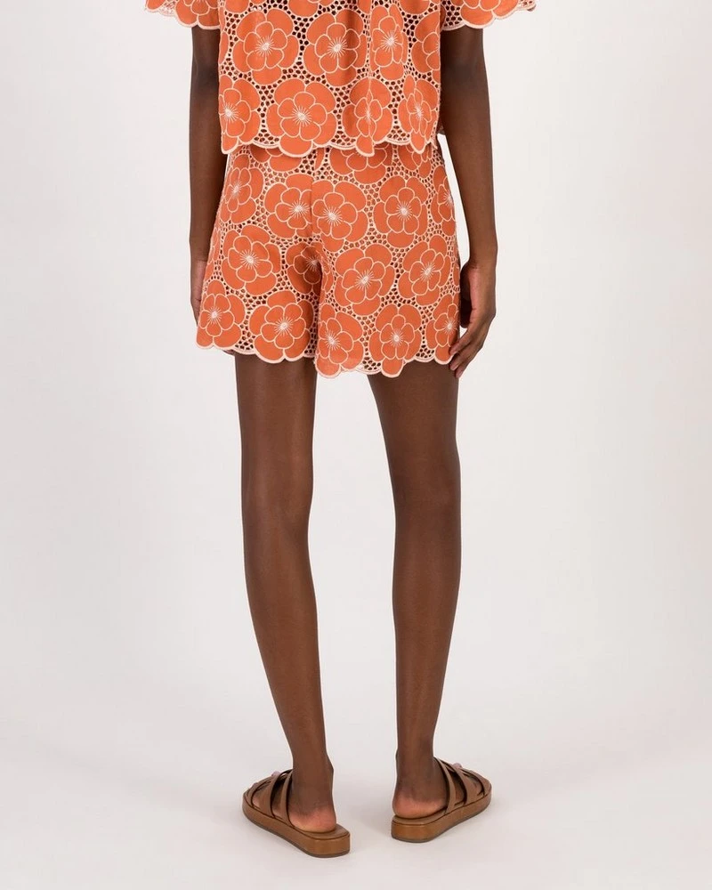 The top-selling Bonnie Shiffley Short Set is back! Now in a stunning terracotta and milk colourway, the 100% cotton shorts feature a fitted waistband with inseam pockets, beautiful schiffli detailing and scalloped hems. The Bonnie Shiffley Shorts are versatile, easy-wearing and are sure to make a statement!Â