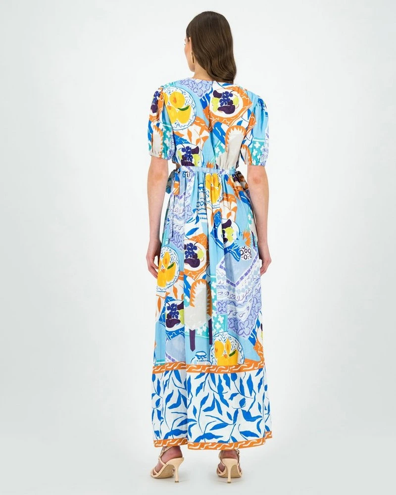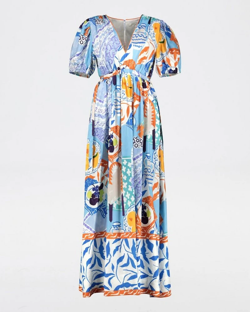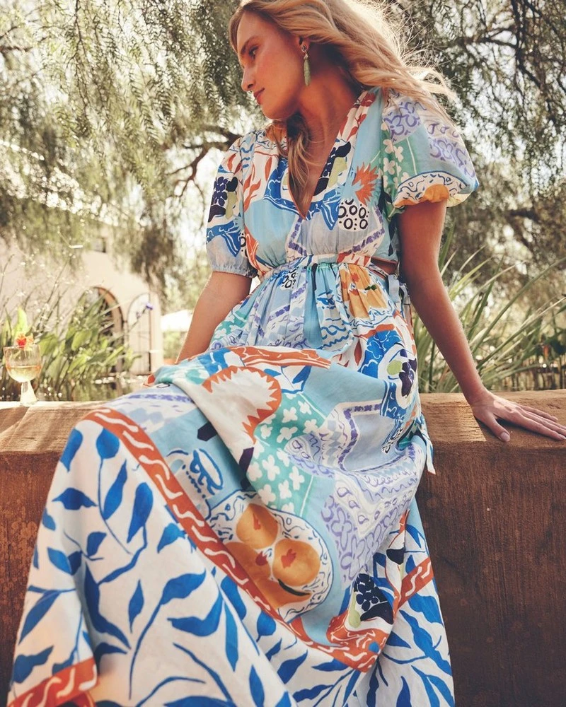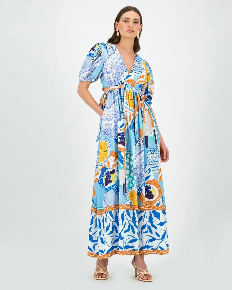 The idyllic Bria Printed Maxi Dress makes a statement. Perfect to wear to an outdoor wedding or garden event, the dress features a deep v-neckline, pockets and side cut-outs with ties. Pair with heeled sandals and drop earrings to complete the look.