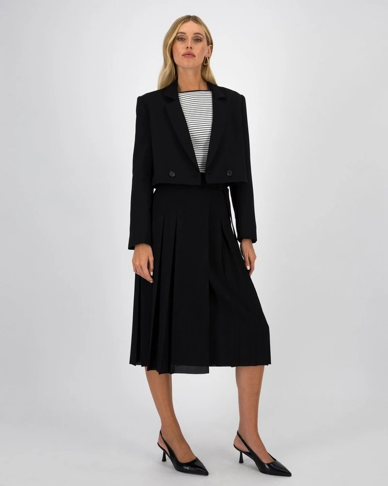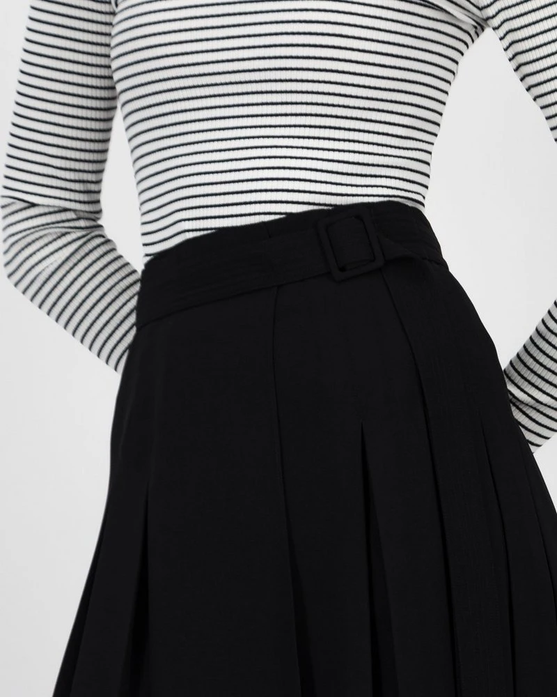 The Burcu Belted Pleated Skirt is the perfect winter skirt to add to your wardrobe. It features bold pleats throughout that are flattering while the slit adds a touch of femininity to the piece. Pair with your favourite knee-high boots, long-sleeve top and coat for a fashionable winter look.
