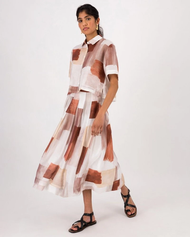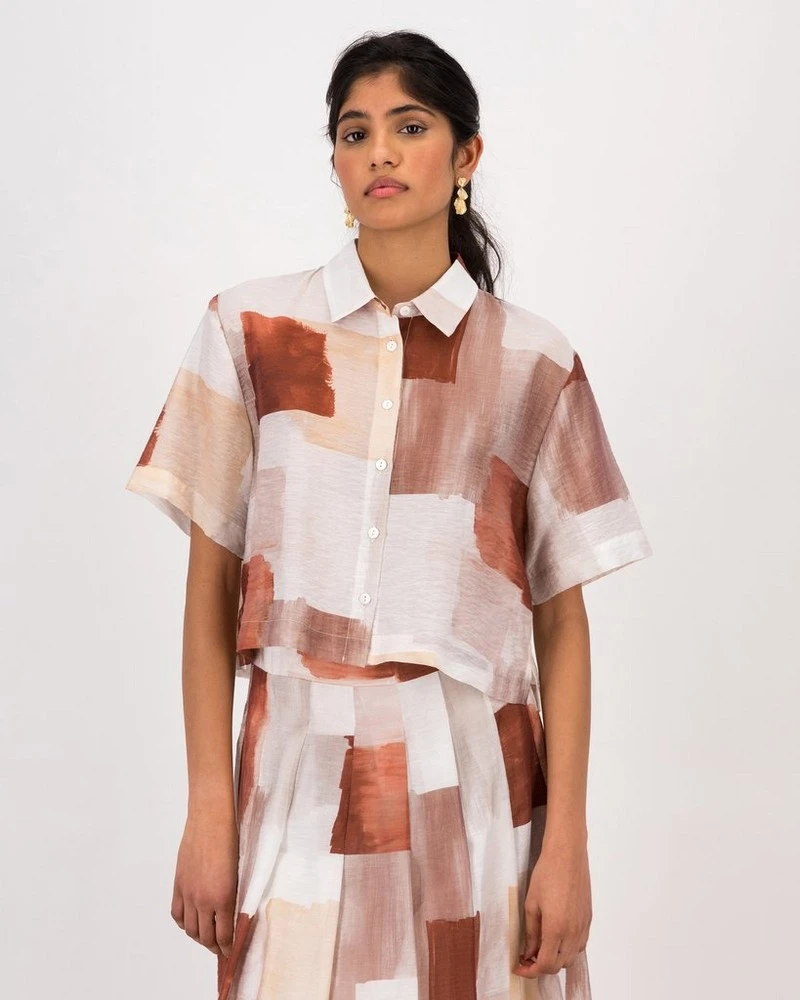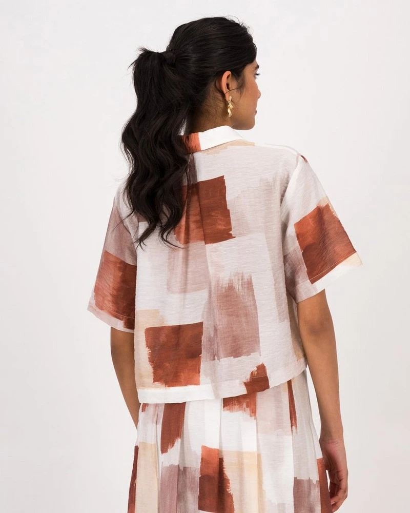 Say yes to the set this season with the Caden Shirt and its matching skirt. Locally made from a lightweight plant-based viscose with a neutral abstract print, the shirt features a cropped boxy fit with a classic collared neckline, a full-length button down and elbow-length sleeves.