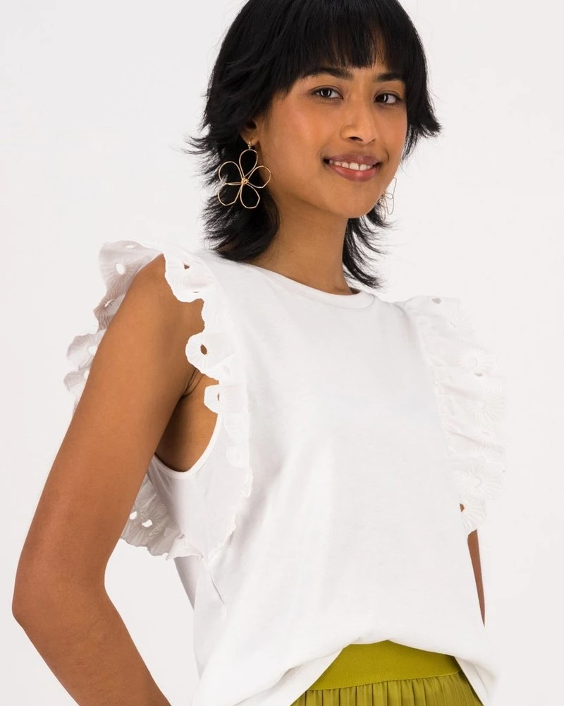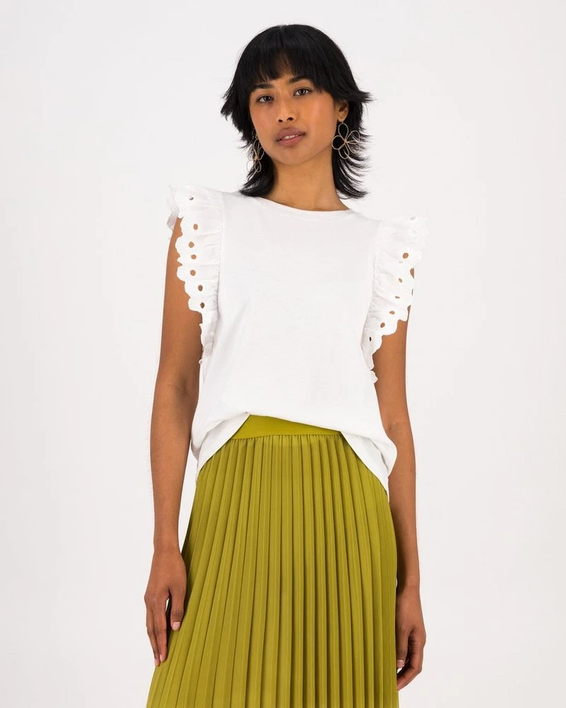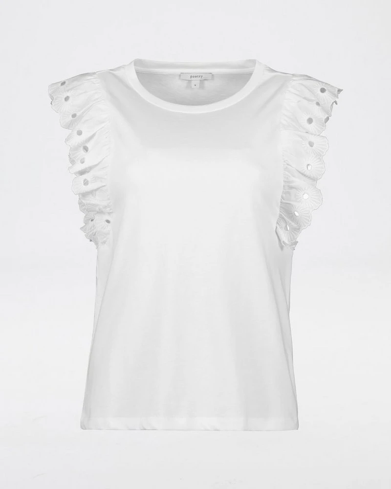 Make a statement this season with the Caitlin Embroidered T-Shirt. Made from a lightweight plant-based cotton, this top features a rounded neckline and short cap sleeves with frill anglaise detail, adding to its feminine statement style.