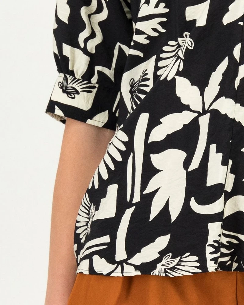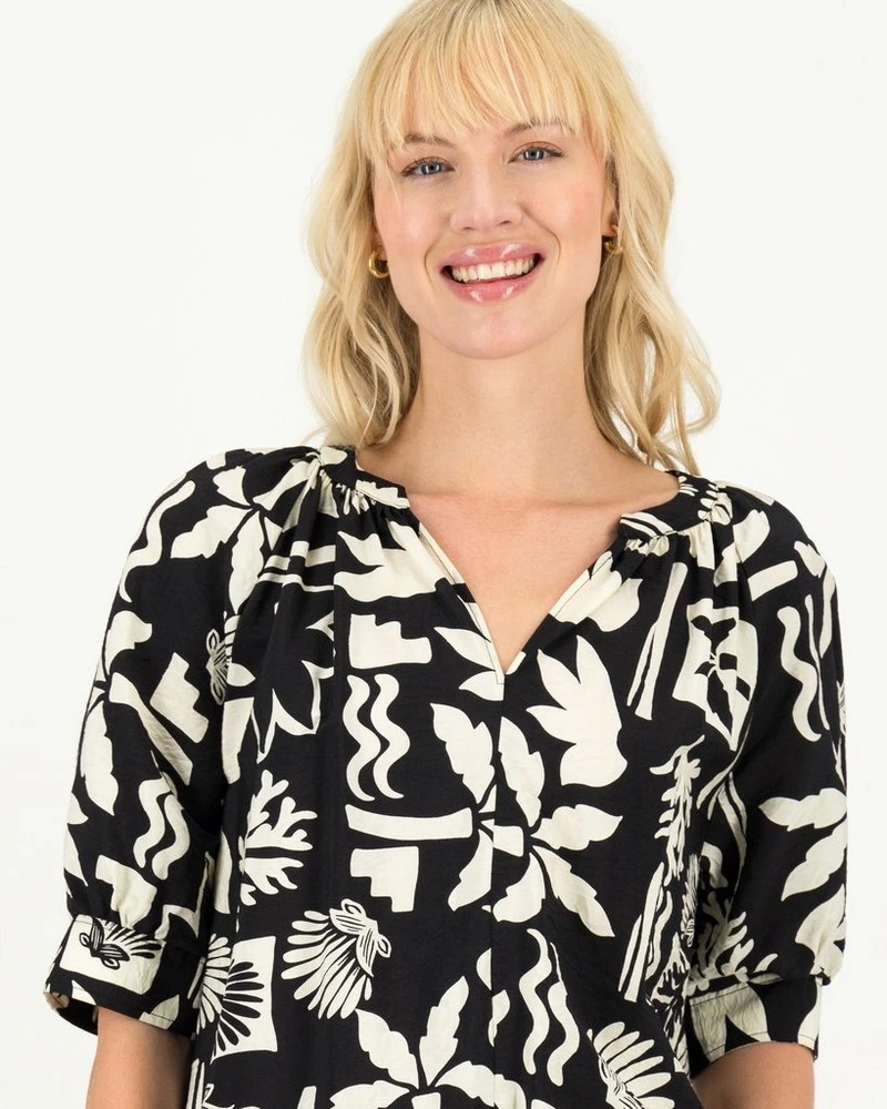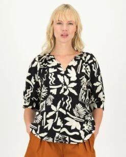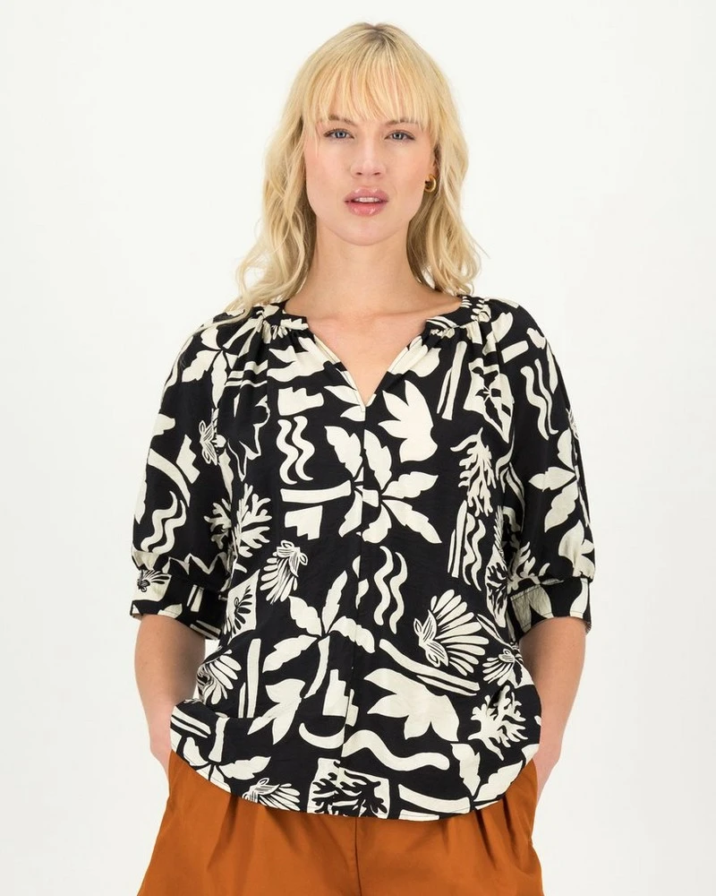 The Carey Popover Blouse makes a statement, thanks to the interesting design of the fabric. The plant-based viscose blouse features a relaxed fit and v-neck to keep you comfortable throughout the day.Â