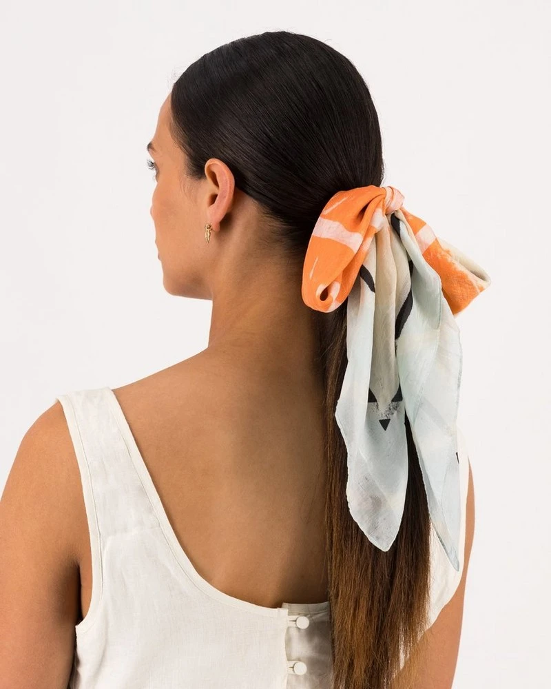 A classic addition to your scarf collection, the Carmelita Silk Scarf lends a vibrant element to your look. Use the bow to create a bow in your hair or to keep your hair out of your face.Â