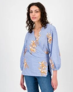 Upgrade your wardrobe with the Chelsea Wrap Embroidered Blouse. Made from a luxe cotton poplin, the top features vertical stripes, floral embroidery and a flattering wrap style to make you feel your best.Â