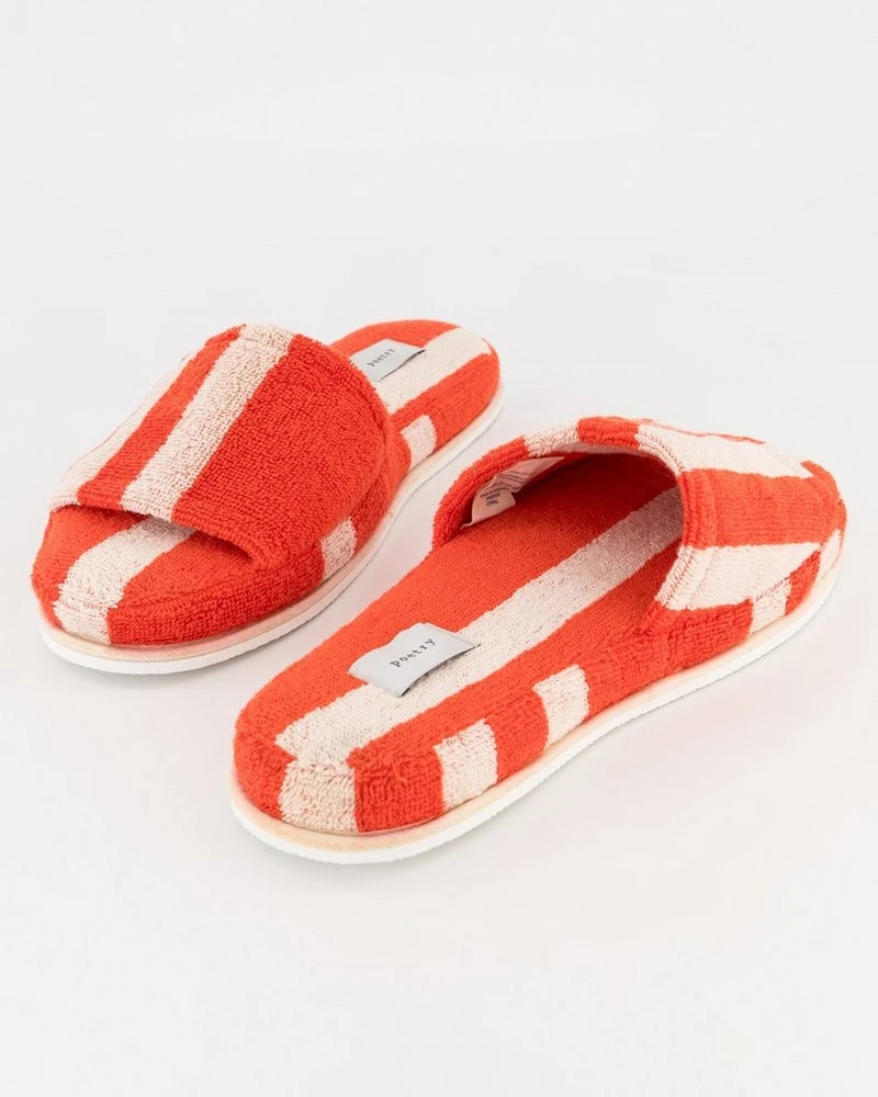 Slip into comfort with the Deana Stripe Toweling Slipper. Made with cosy toweling, and featuring bright coral stripes, this slipper is perfect to slip on after a long day of lounging in the sun.Â