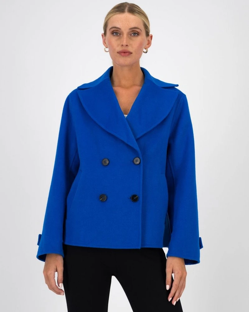Stay warm on cooler days with the Edda Melton Peacoat. Expertly tailored, the piece is double breasted and features notched lapels for a chic, crisp garment.Â
