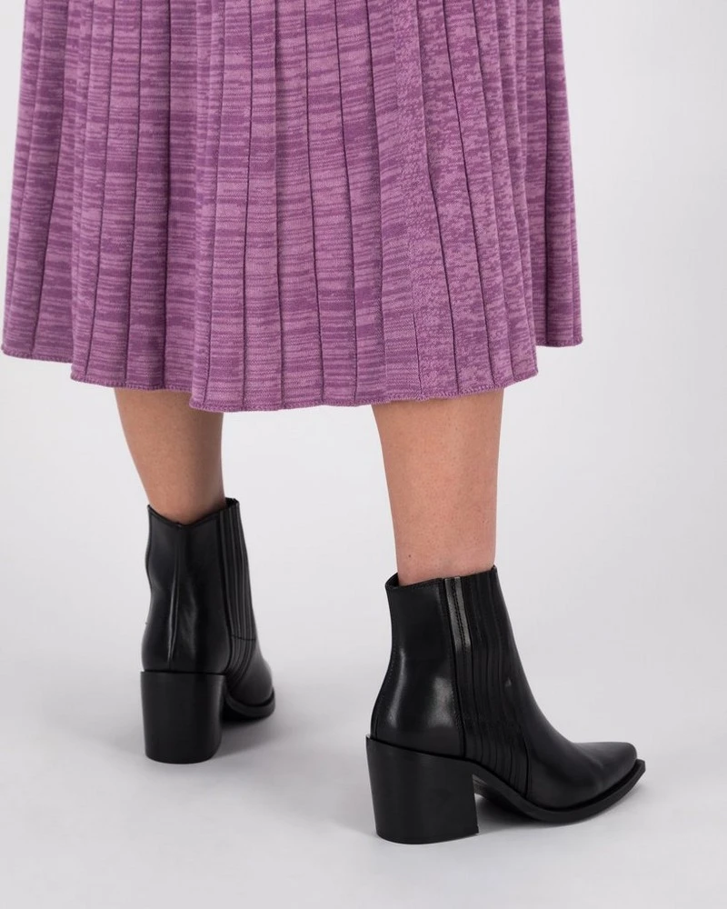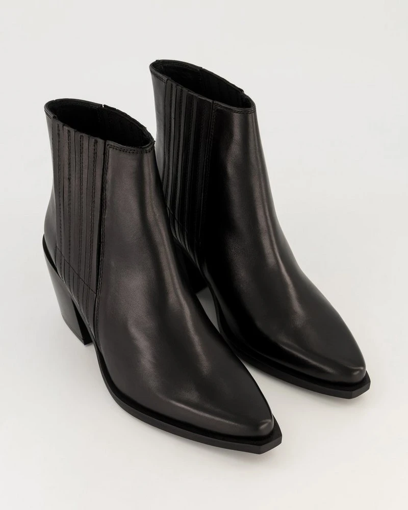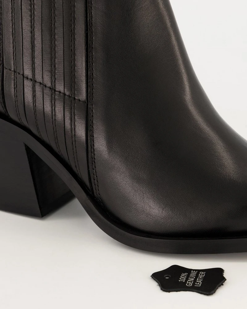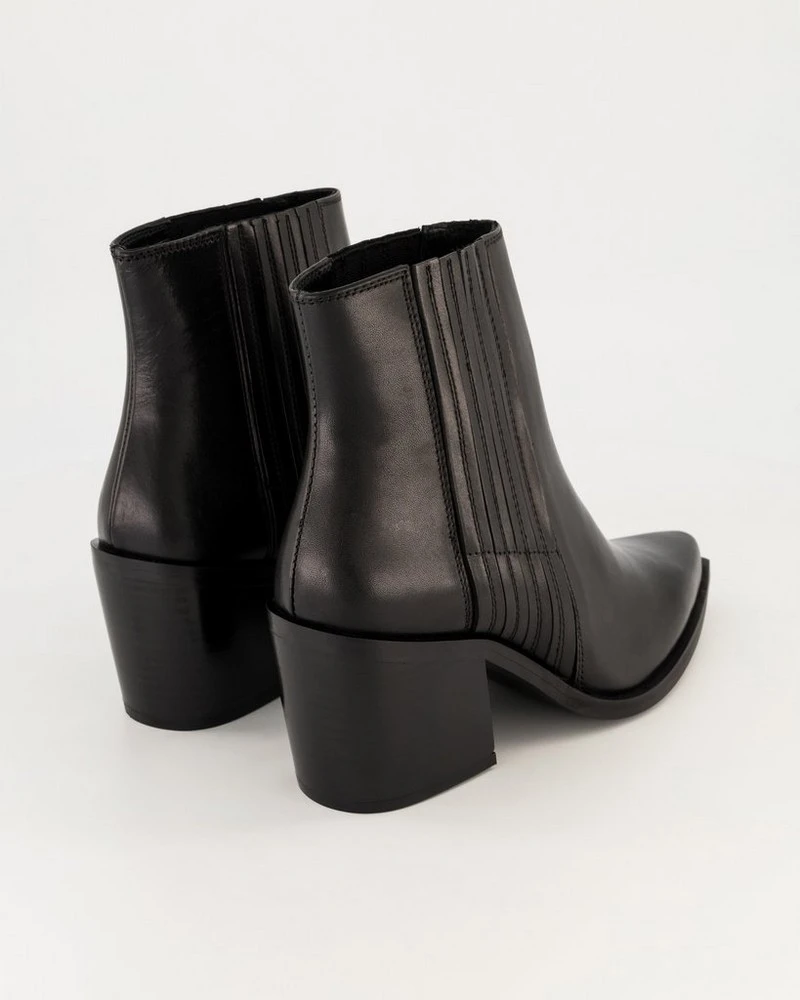 Hop into style with the Everly Boot. Made from 100% leather, this pointy-toed cowboy-styled boot has a block heel and intricate side detailing that makes this piece easy to style. Â
