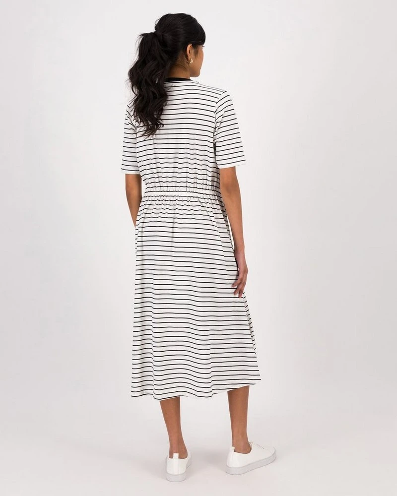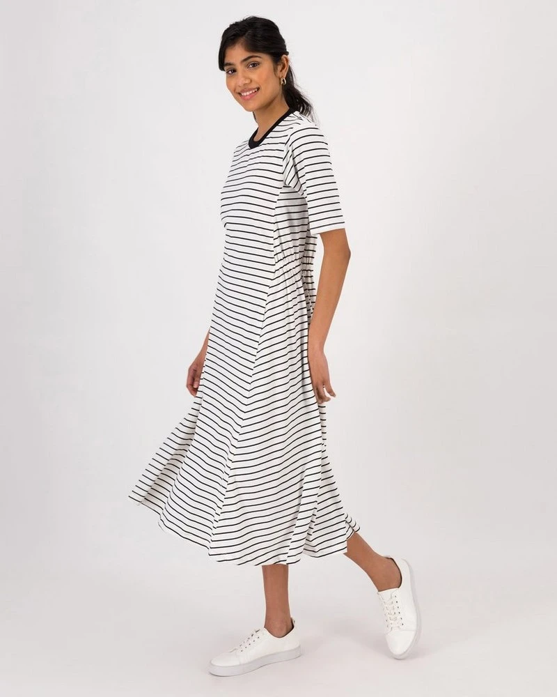 Take classic to the next level with the Faye Stripe Knit Dress. This fit and flare dress is crafted from a lightweight cotton knit fabric, making it ultra-comfortable to wear during the warmer season while the elasticated back detail cinches in the waist for a more form-flattering silhouette.Â