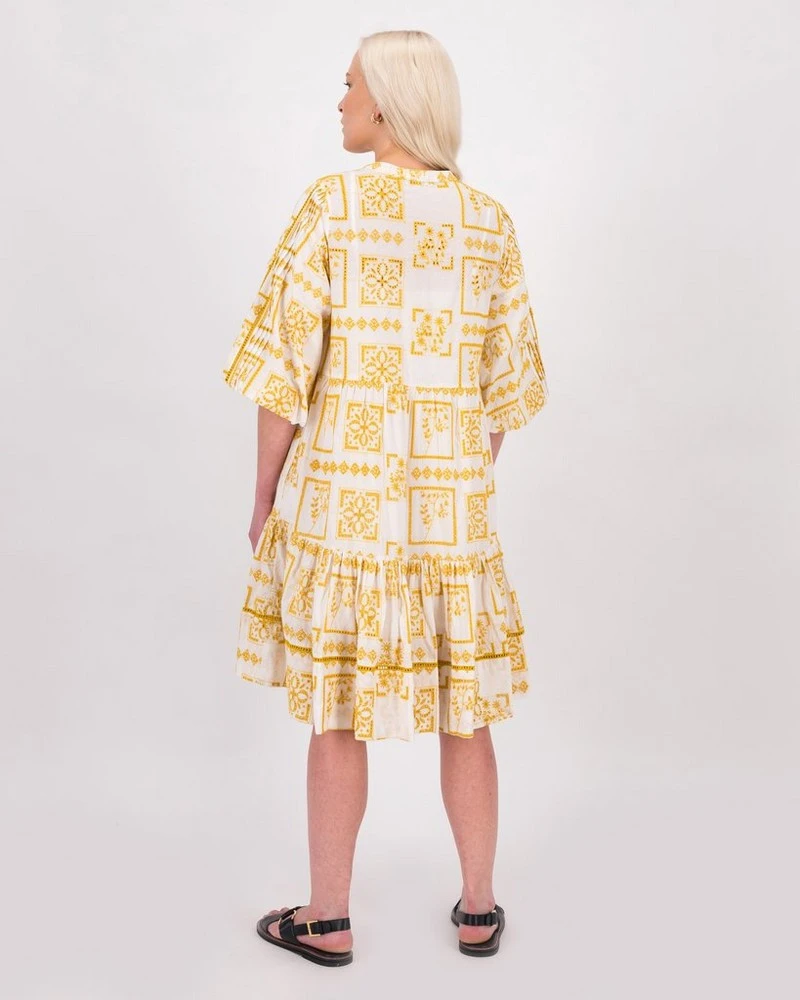 Make a statement this season with the Ginger Tiered Dress. Locally made from an easy-breezy plant-based cotton with a unique geometric print, the knee-length dress features a rounded neckline, three-quarter sleeves and a multi-tiered skirt.