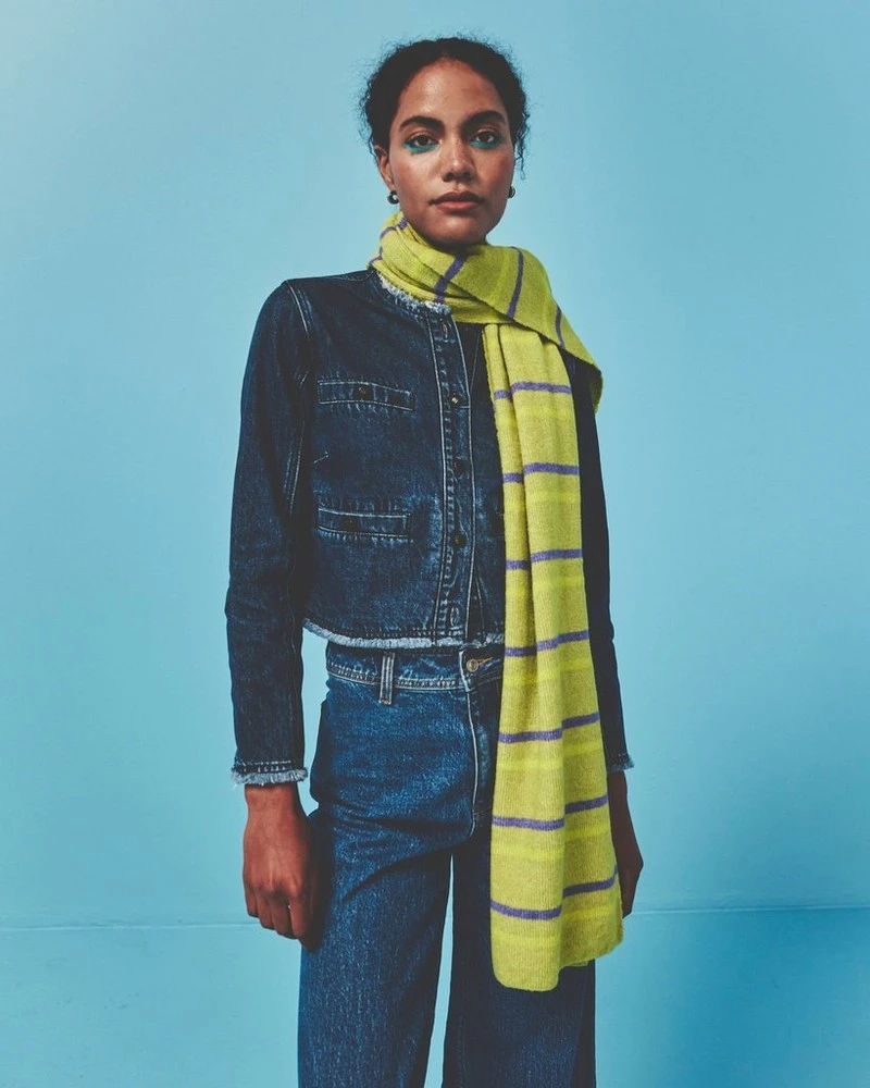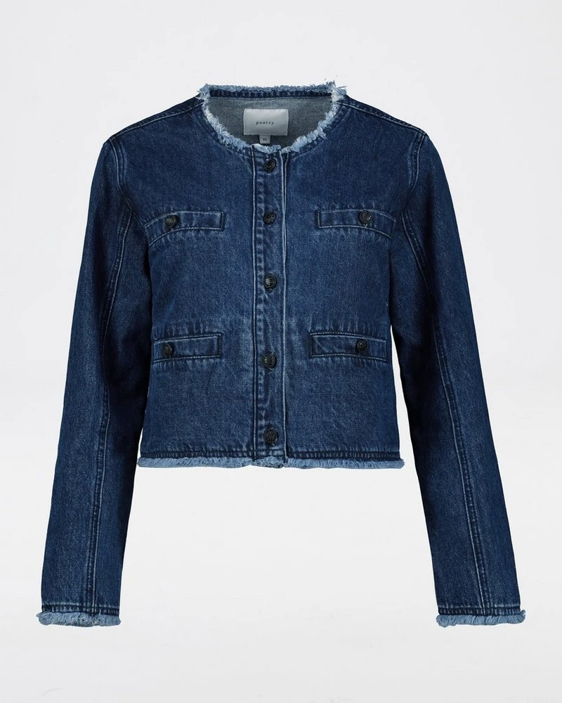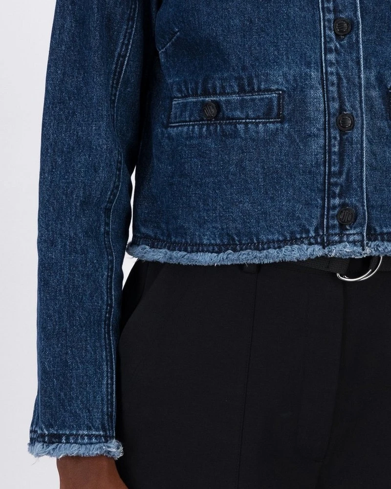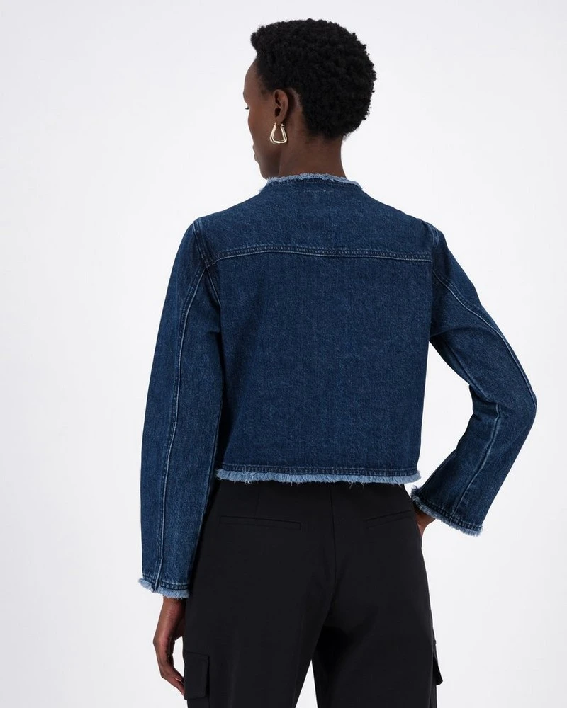 A unique twist on a classic, the Gretchen Raw Edge Collarless Denim Jacket is a fun addition to any wardrobe. The cropped jacket pairs perfectly with most looks, and one of our favourite ways is to wear alongside a belted high-waisted pants and basic tee.Â