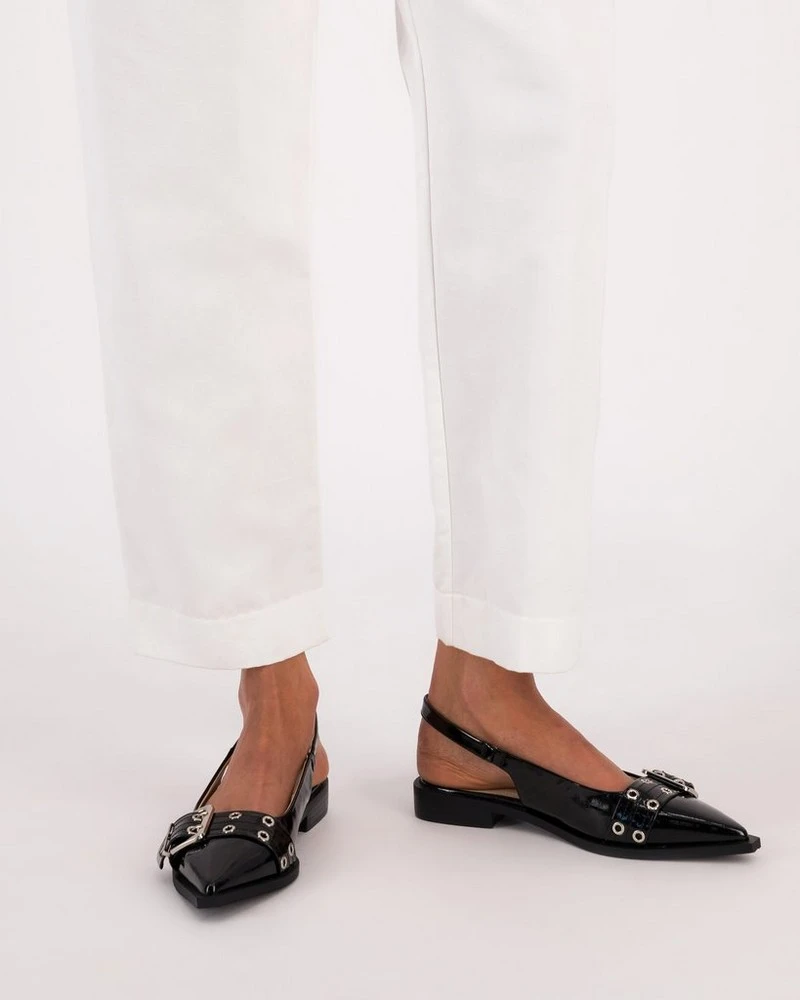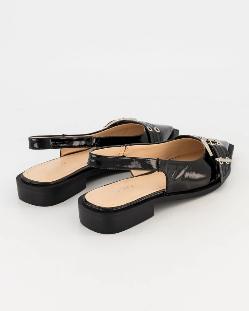 The edgy Halle Buckle Slingback Mule is a must-have this season. With a subtle nod to the classic ballerina flats, these rockstar-esque mules are made from leather and feature a buckle across the foot along with a pointed toe. Â