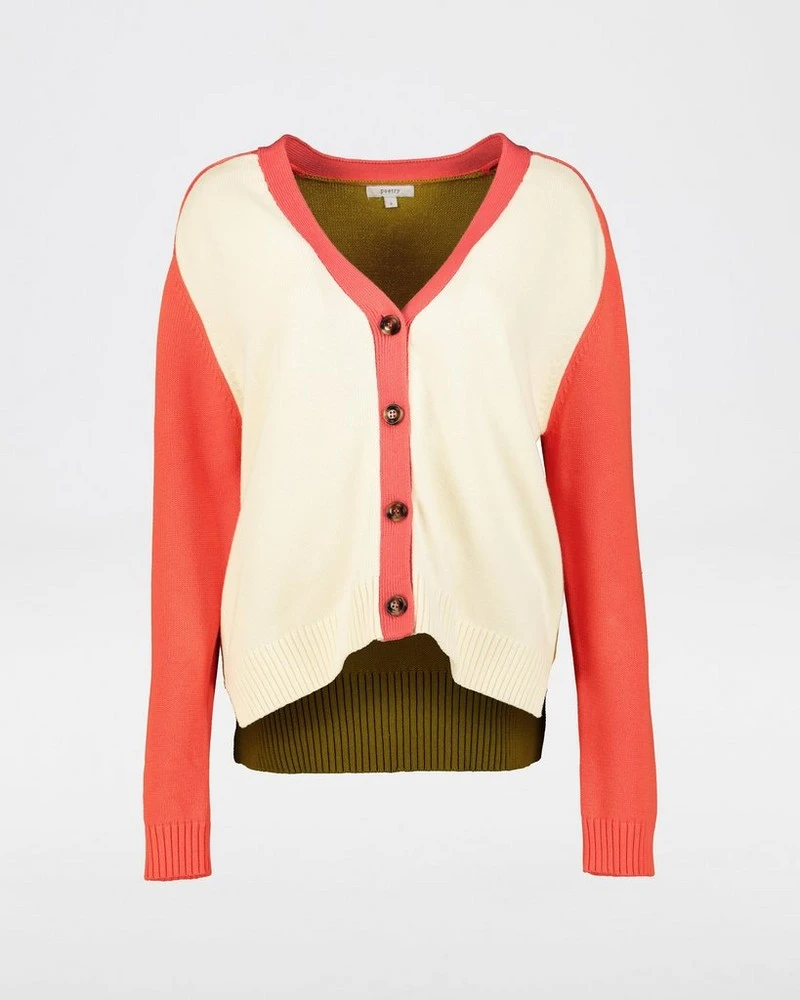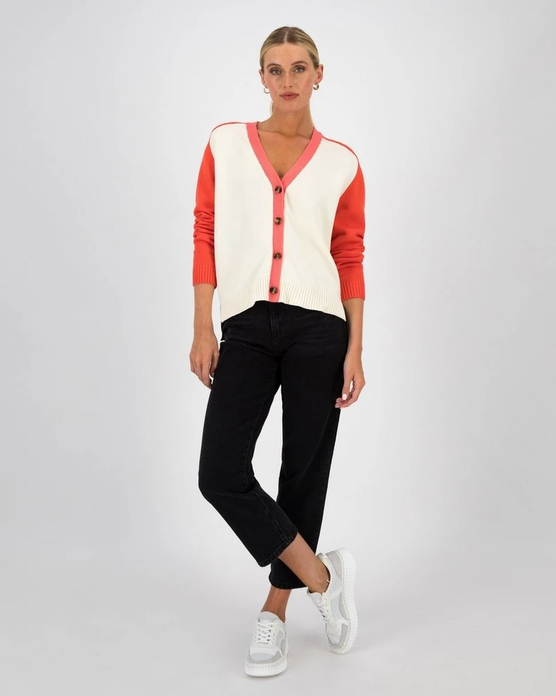 Liven up your winter wardrobe with the Hermione Colourblock Cardigan. The soft cotton fabric has a beautiful drape, and features bold colourblocking that is a step away from the usual winter colour palette.Â