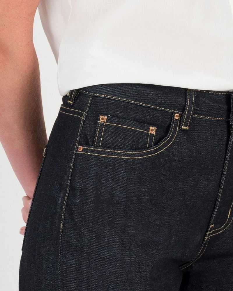 Made from selvedge denim which is a higher quality denim which is typically sold and worn unwashed d- it is a true raw denim. Selvedge is the narrow, tightly woven band on both edges of the denim fabric. It prevents the edge of the denim from unravelling and shows a clean, finished look. This type of denim is more durable and retains its pigment for longer.