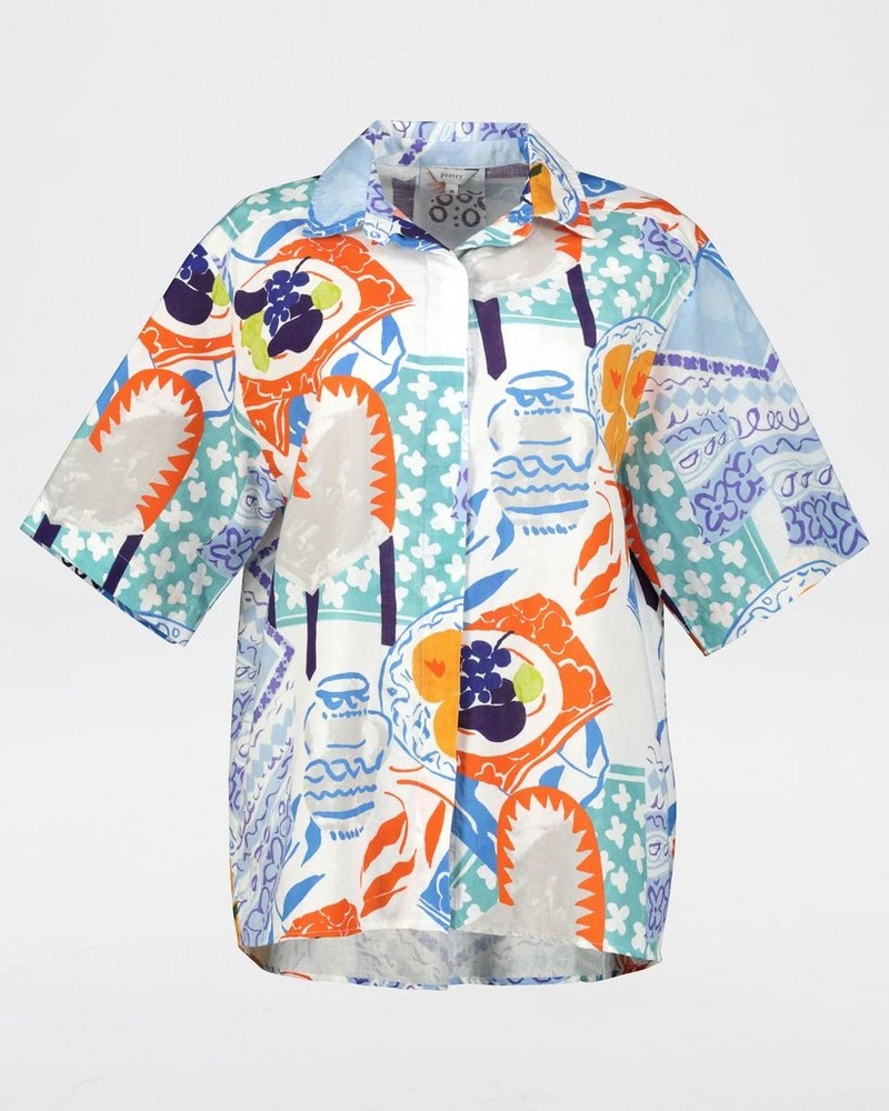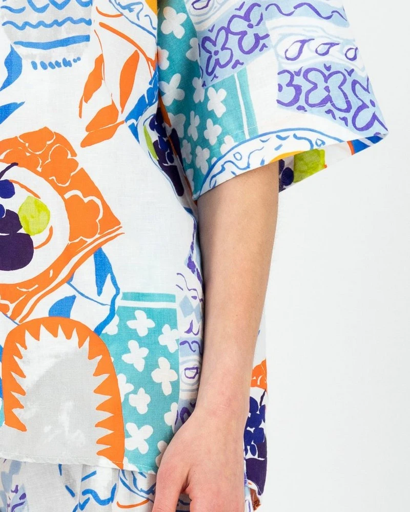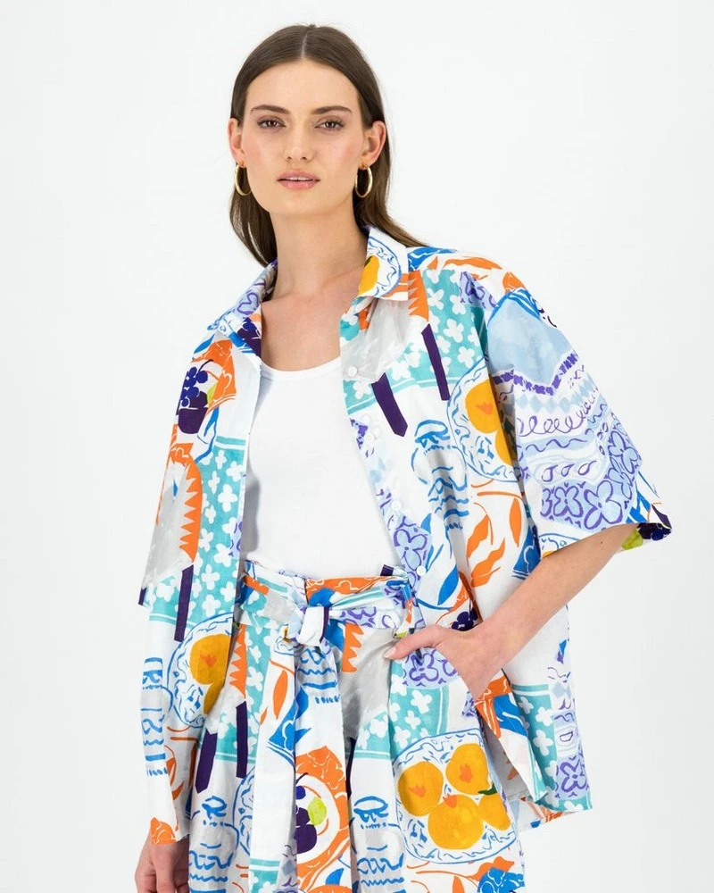 The vibrant Jil Printed Shirt Set is the epitome of summer. Locally produced from a cotton linen blend fabric, this relaxed-fit shirt is a must-have if you love bold design. Go all out by pairing her with the Jil Paperbag Printed Short.Â