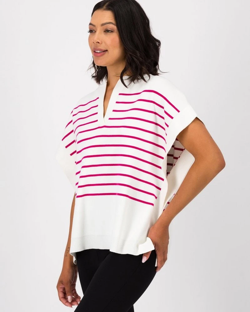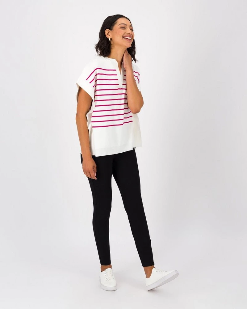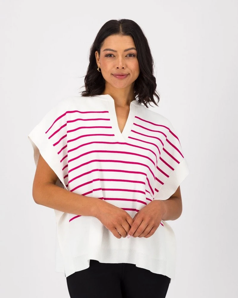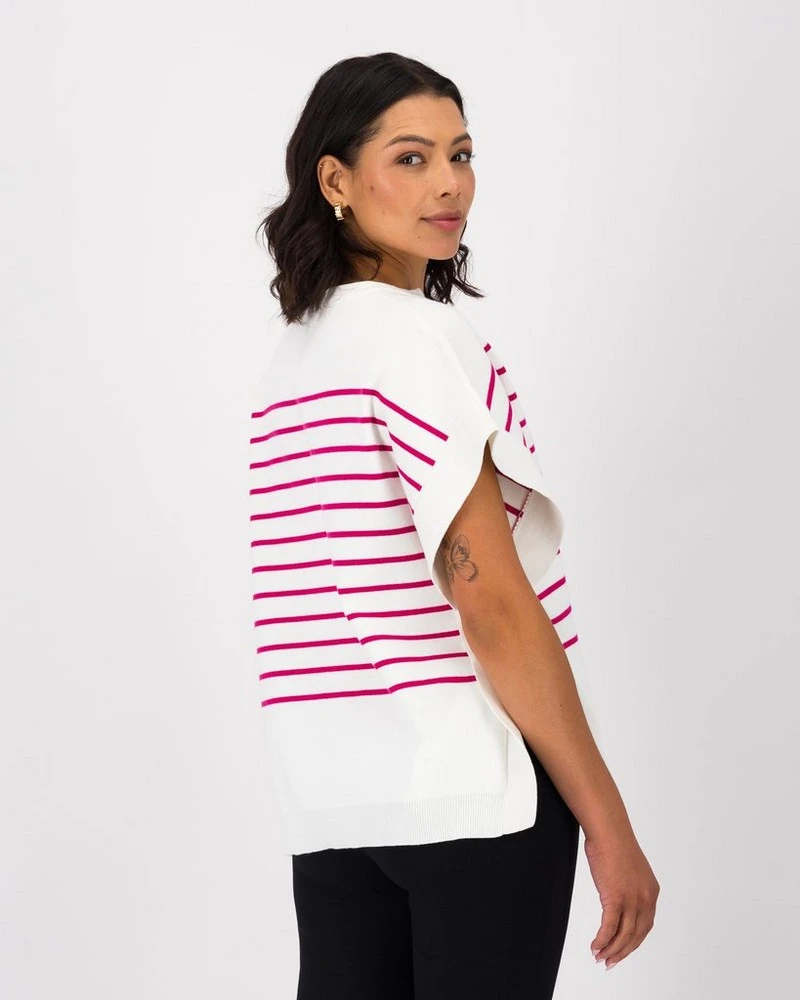 The Jullian Stripe Kimono is flattering and versatile. It features a flowy silhouette with contrasting stripes across the body. Made from cotton, it’s easy to style over a crisp white shirt and blue jeans for a chic casual look.