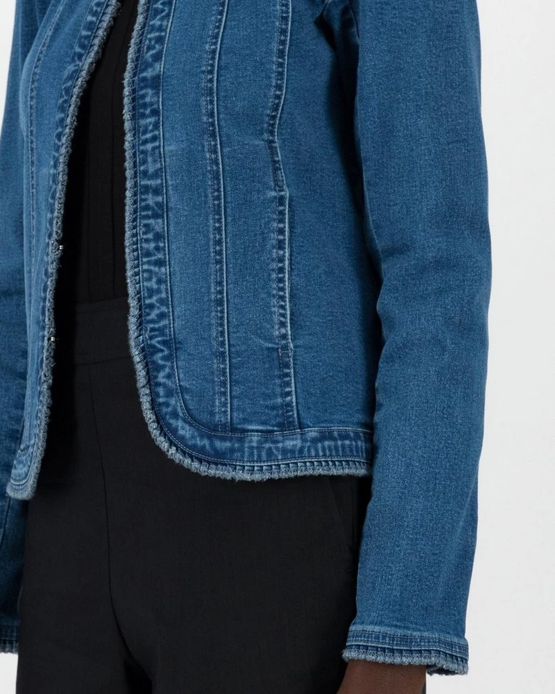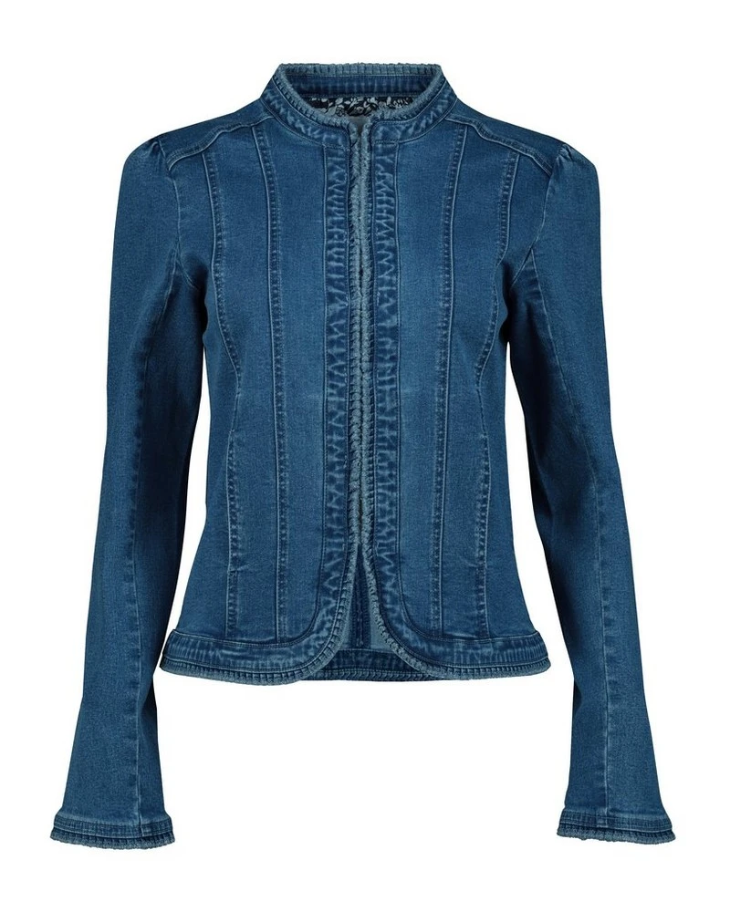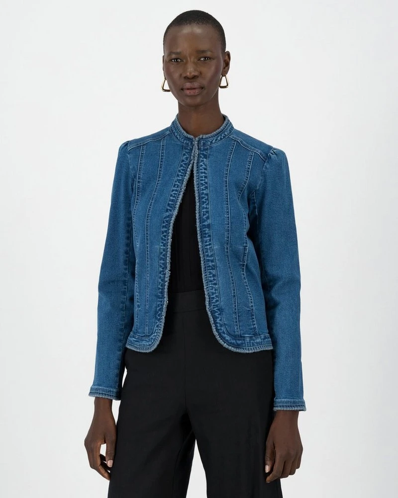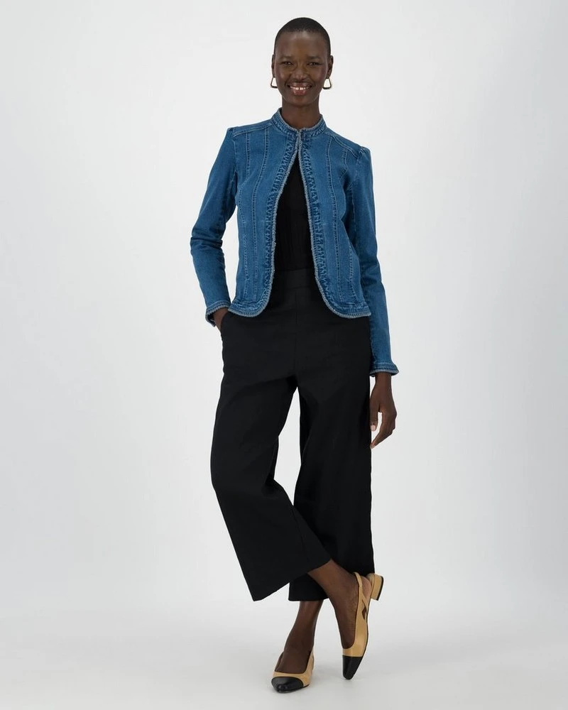 Add a timeless and versatile piece to your wardrobe with the Katalina Denim Jacket. The collarless piece features a stunning ruffle detail around the edges and cuffs, while the hook and bar closures create a seamless silhouette.