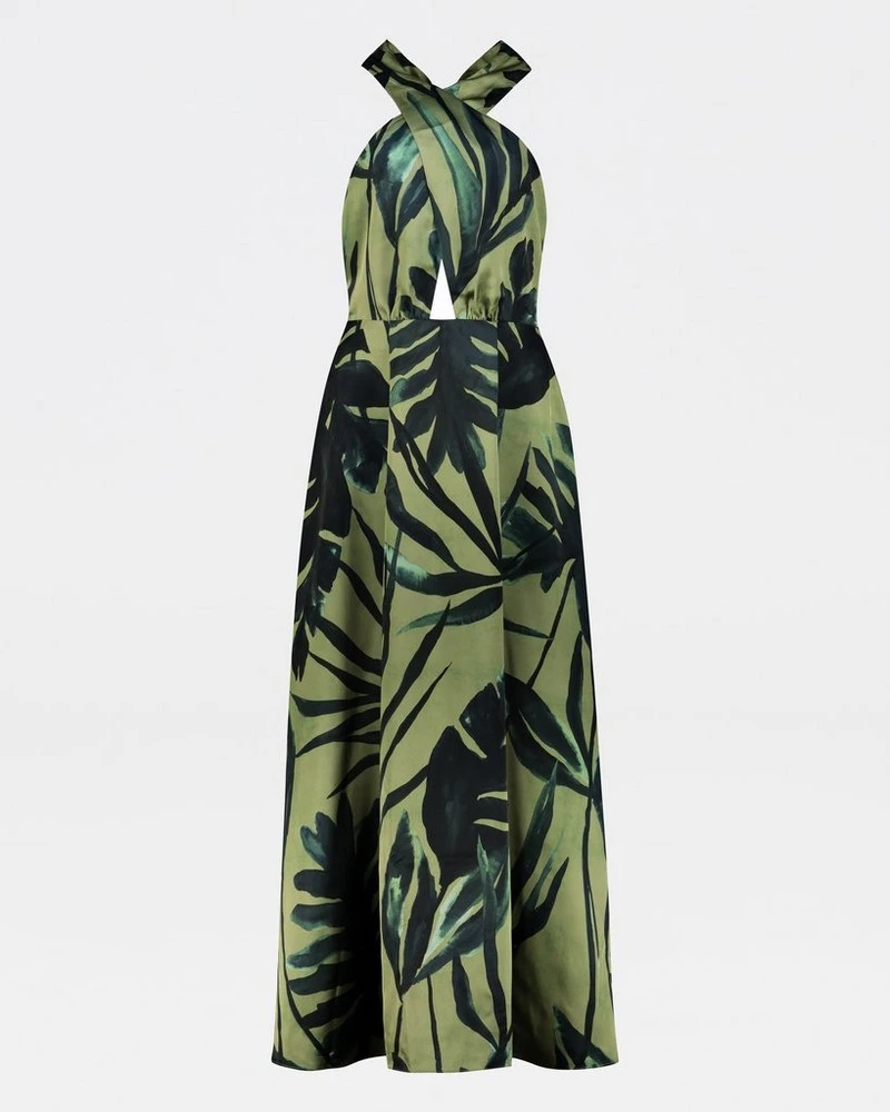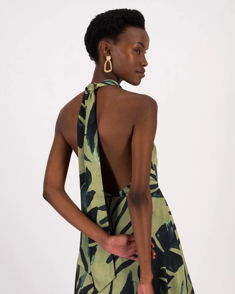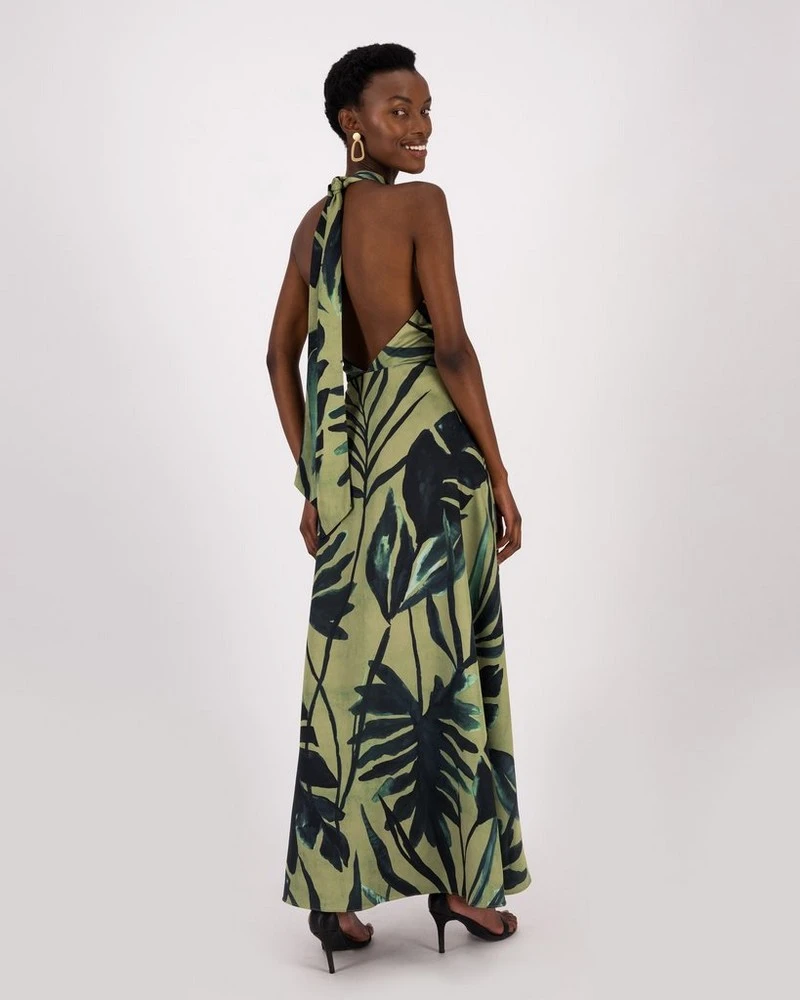 Embrace the tropical vibe with the Katya Halterneck Dress. Featuring a front cut-out and halterneck tie detail, this slim-fit maxi dress is sure to turn heads! The dramatic train adds dramatic movement and when paired with a pair of strappy sandals and co-ordinating earrings, this look is perfect for a summer wedding!Â