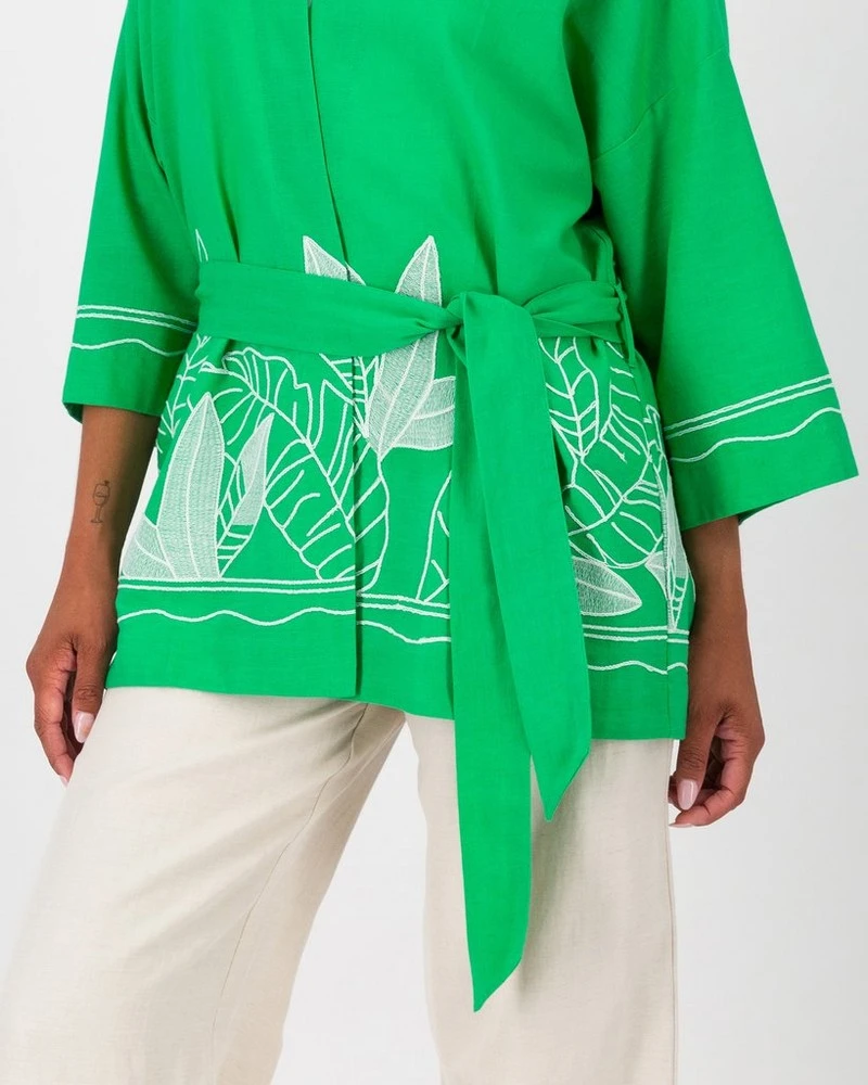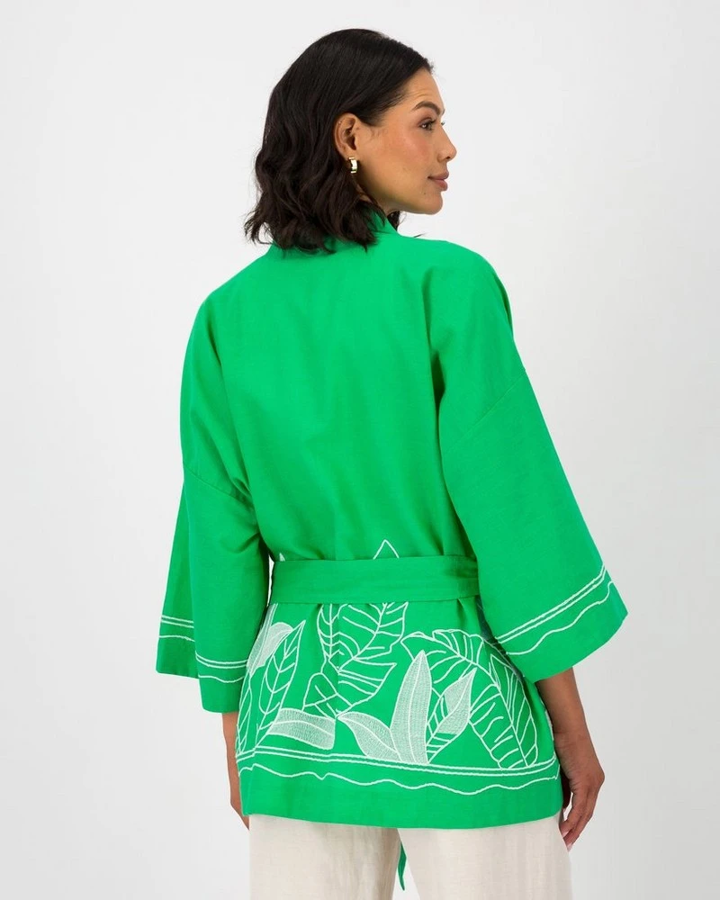 The Kira Embroidered Kimono is the perfect addition to your outfit. It’s made from a comfortable cotton flex, with a traditional kimono design, mid-length sleeves and a tie around the waist. Laze around in comfort and style, the embroidered floral print elevates the piece effortlessly.Â