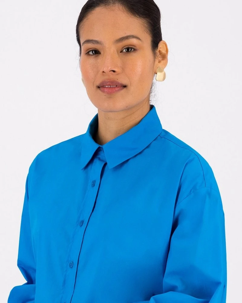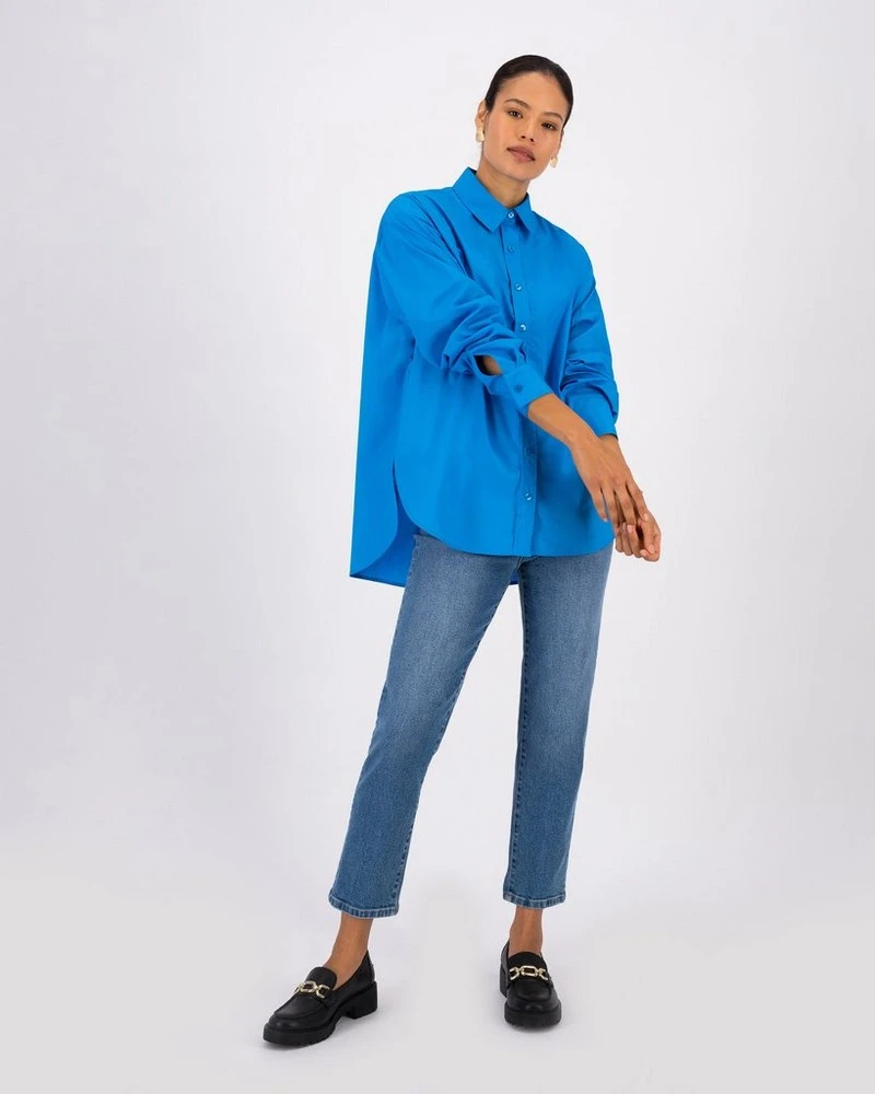 Structured, tailored, and versatile, the Lourdes Relaxed Shirt can be dressed up or down. Locally made from sustainably sourced cotton, it features a classic collared neckline with a full-length button-down, long button-cuffed sleeves and side slits for ease of movement.