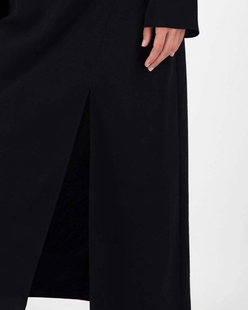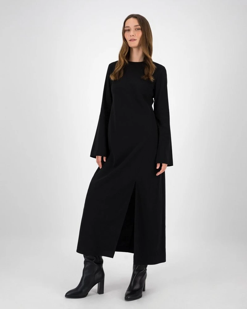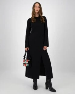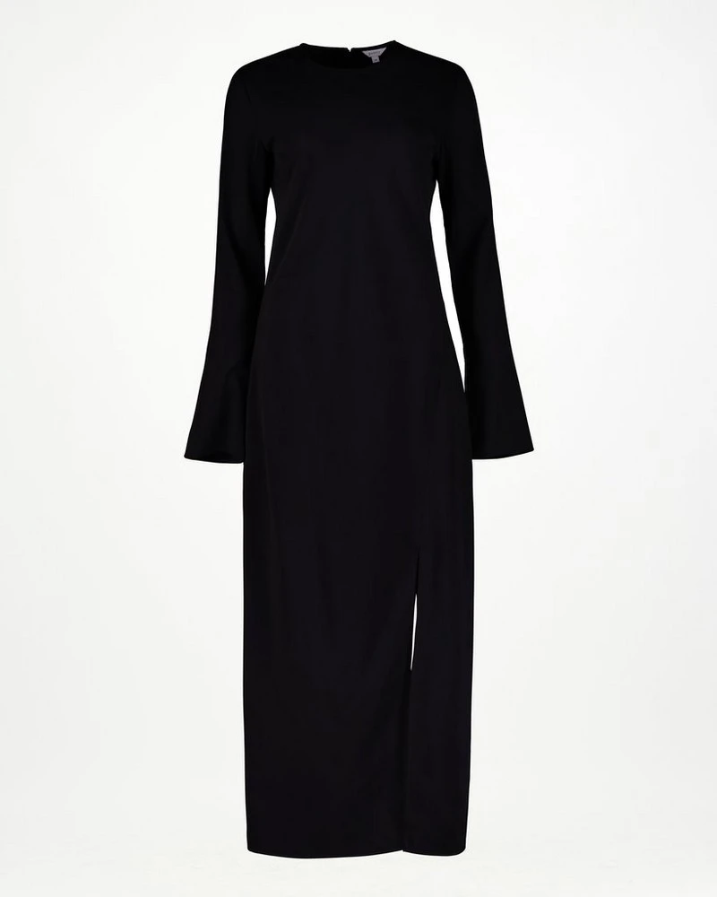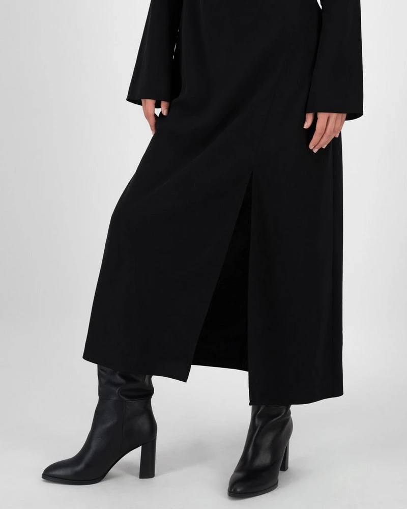 The Maeve Bias Cut Dress is a piece that exudes understated sophistication. It is a slim fit cut, that hugs the body in all the right places, while the wide sleeves and high slit add soft femininity to the piece. Pair with longer-length heeled boots for an eye-catching look, with the addition of a placement animal spot print.