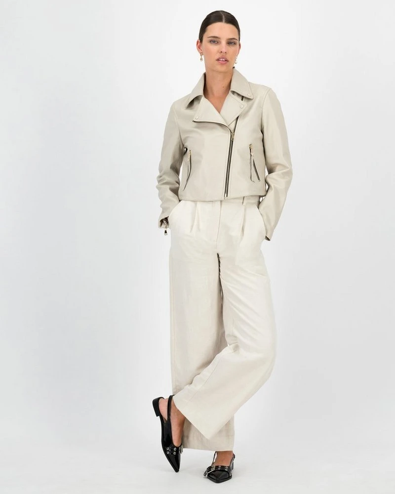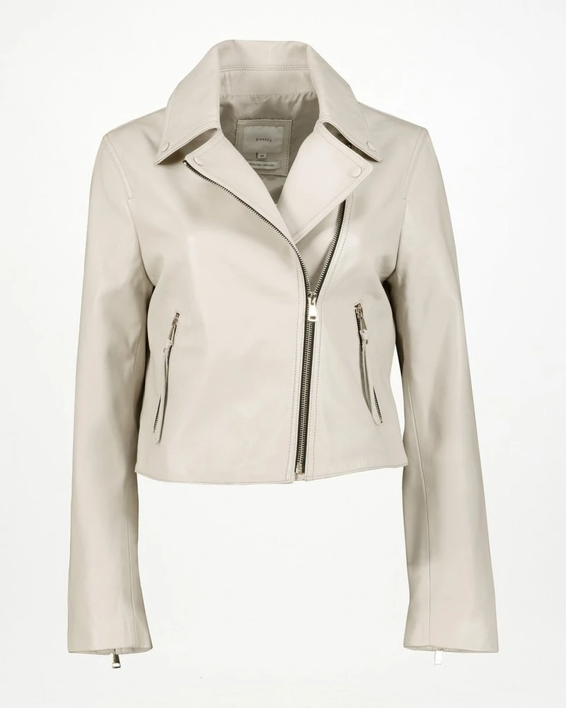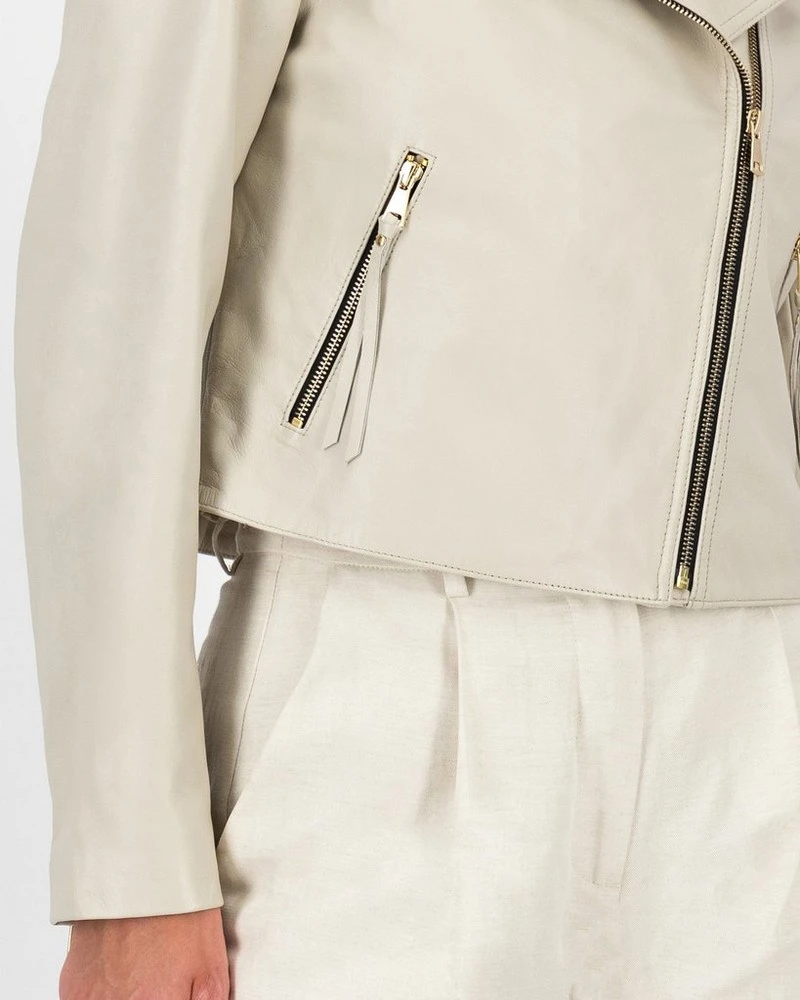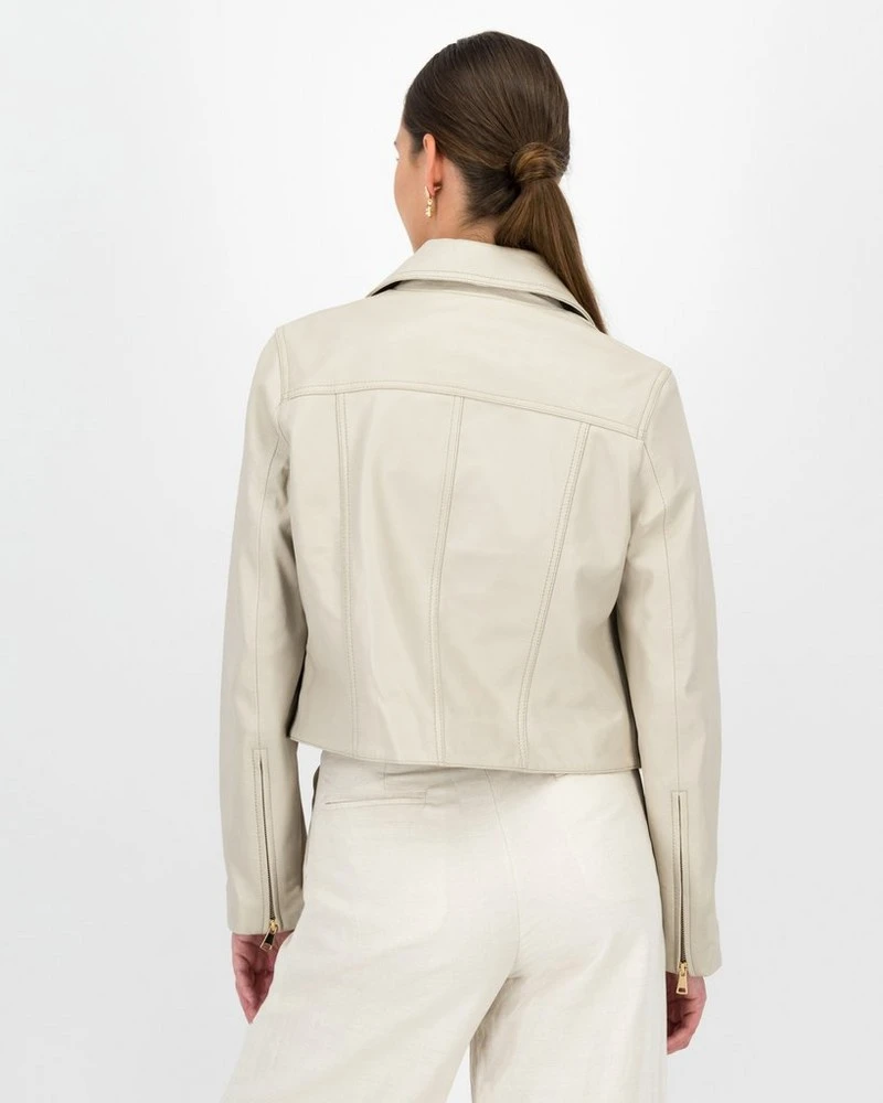 Channel your inner edge in the Mai Biker Leather Jacket. With it’s quintessential biker jacket silhouette, Mai features notched lapels with black studs, and gold-toned hardware on the zip and pockets. The cropped length makes it perfect to wear with dresses, skirts and pants.Â