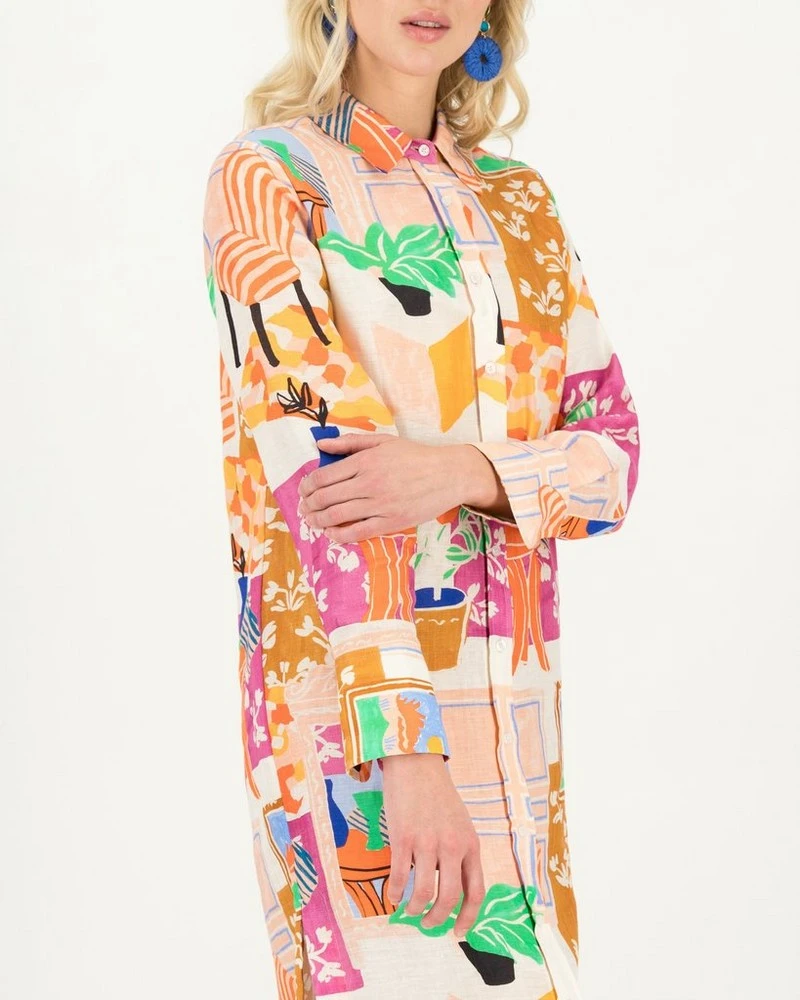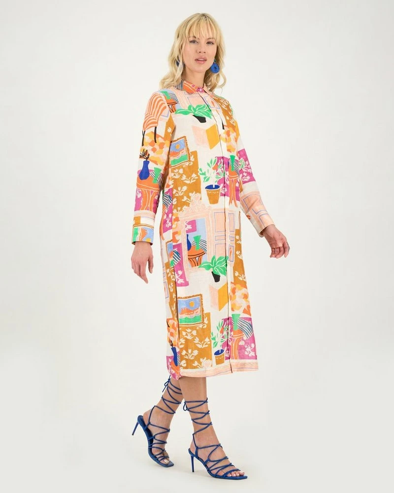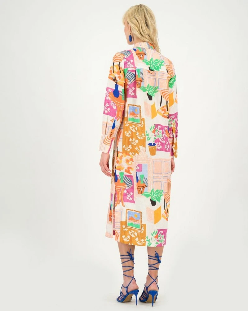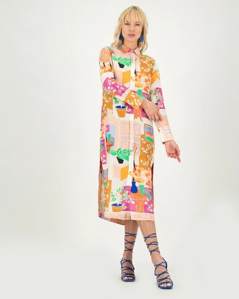 Casual, comfortable and in a pop of colour, the Marly Dress. Made from a lightweight plant-based linen blend in a fun summer print, the midi dress features an oversized fit with a classic collared neckline, a full-length button-down and long sleeves.