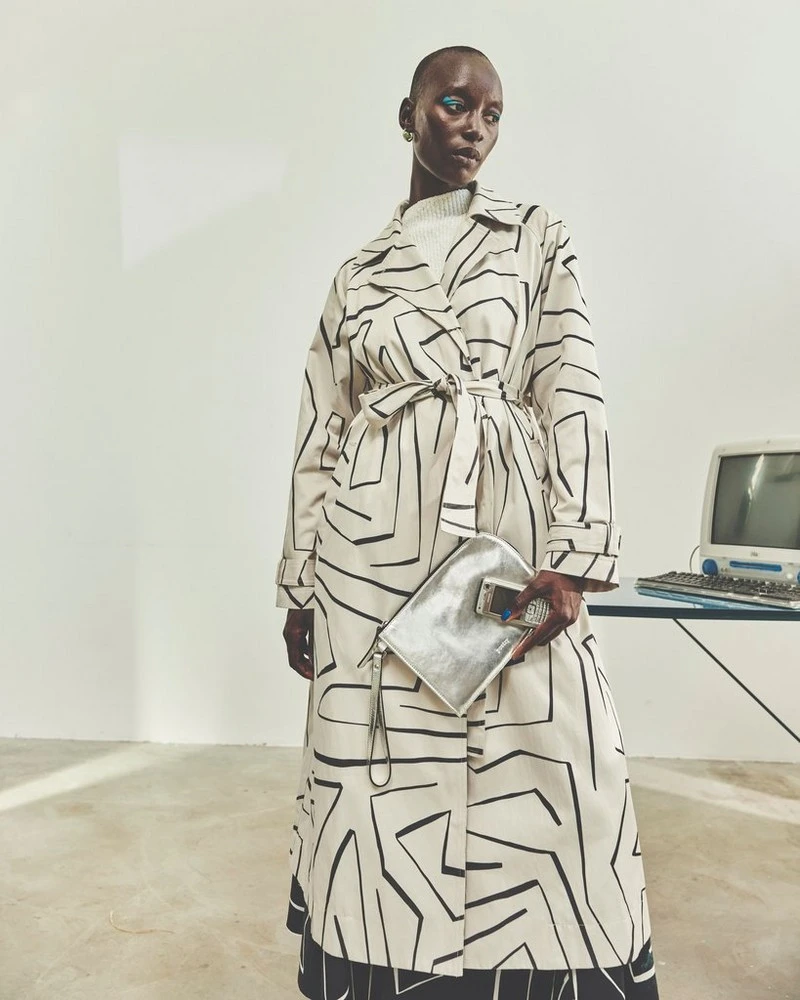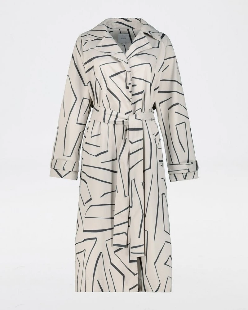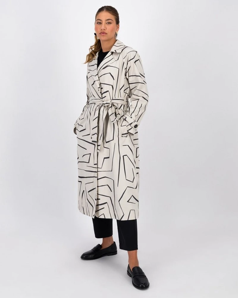 The Mickey Abstract Trench is a must-have, no matter the weather. With its classic design and timeless print, this trench coat is the perfect layering essential.Â