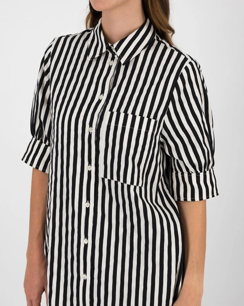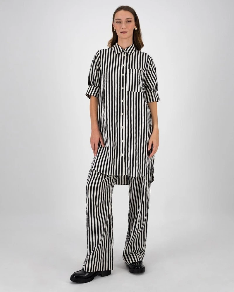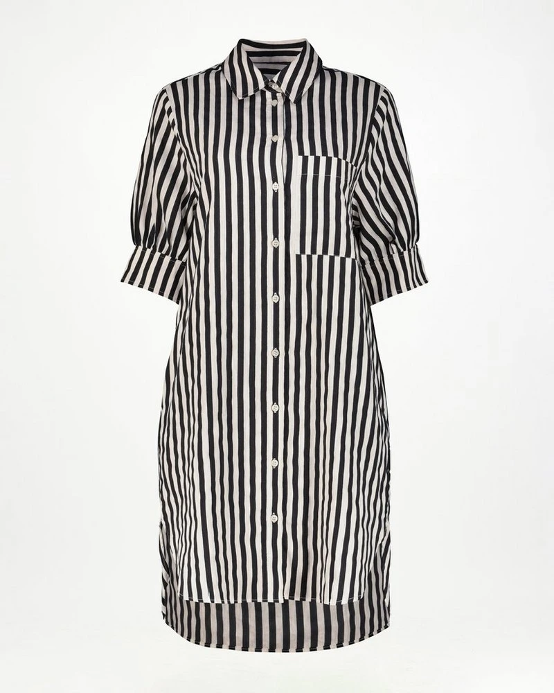 Create the illusion of length with the Opal Black White Stripe Dress. The locally manufactured piece features black and white horizontal strips throughout, and is made from a comfortable linen blend fabric.Â
