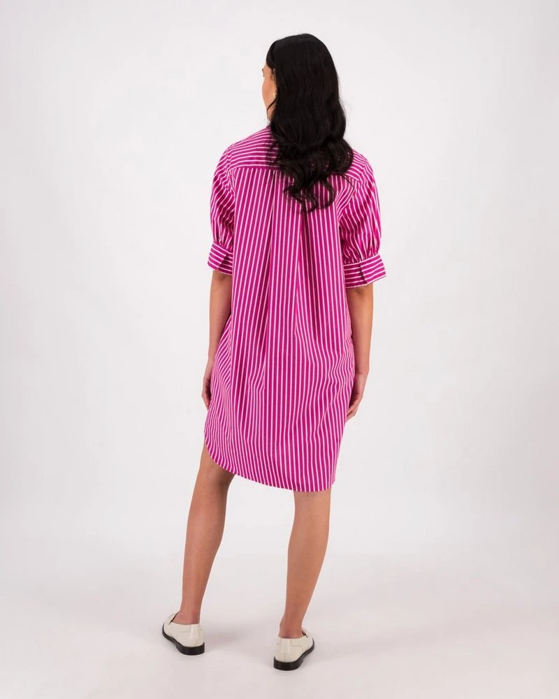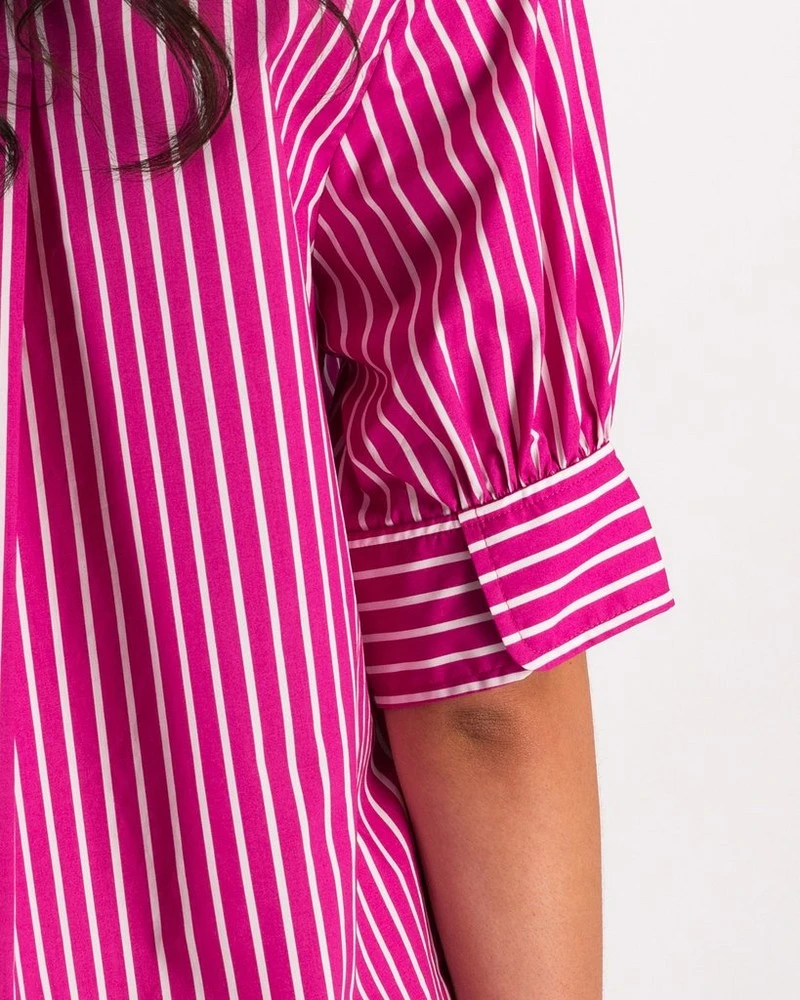 The Opal Striped Shirt Dress is the epitome of modest magic. Not only does it have a flattering fit, but its tunic design makes it a must-have for summer. Locally made from a sustainably-sourced cotton with a striped print, it sits on the knee and features a classic collared neckline with a full-length button-down and elbow-length sleeves.