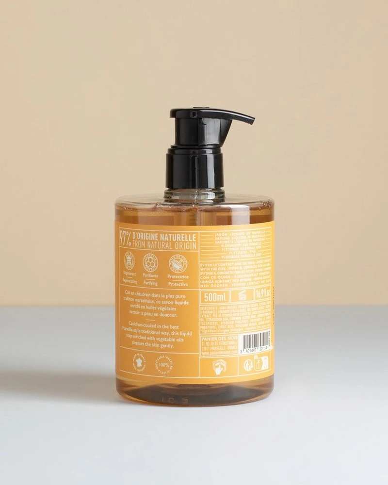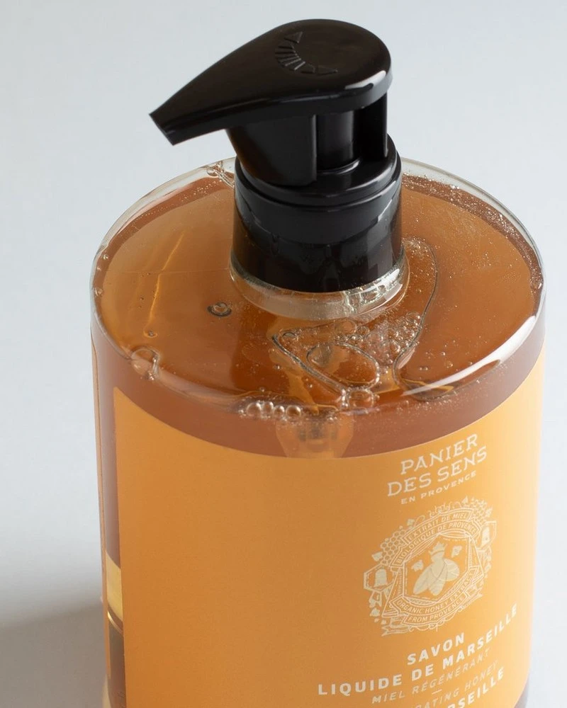The Panier des Sens Honey Liquid Marseille Soap is enriched with plant oils and cauldron-cooked in the best Marseille-style traditional way, and cleanses skin gently.