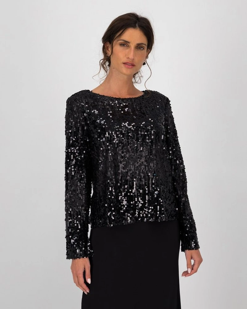 Elevate your look with the elegant Rafaella Sequin Top. The simple design with a rounded neckline and long sleeves, takes it to another level with a stunning sequin design throughout. Pair with some denims for a slightly more laid-back look or with some smart silk pants for a super sleek style.