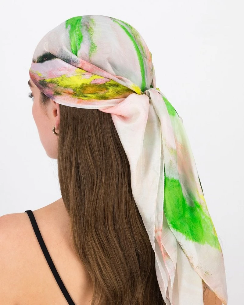 There’s no such thing as too many scarves, so why not add the Relebogile Marble Silk Scarf to your collection? The silk scarf oozes luxury while the vibrant abstract design catches the eye and elevates any look.Â