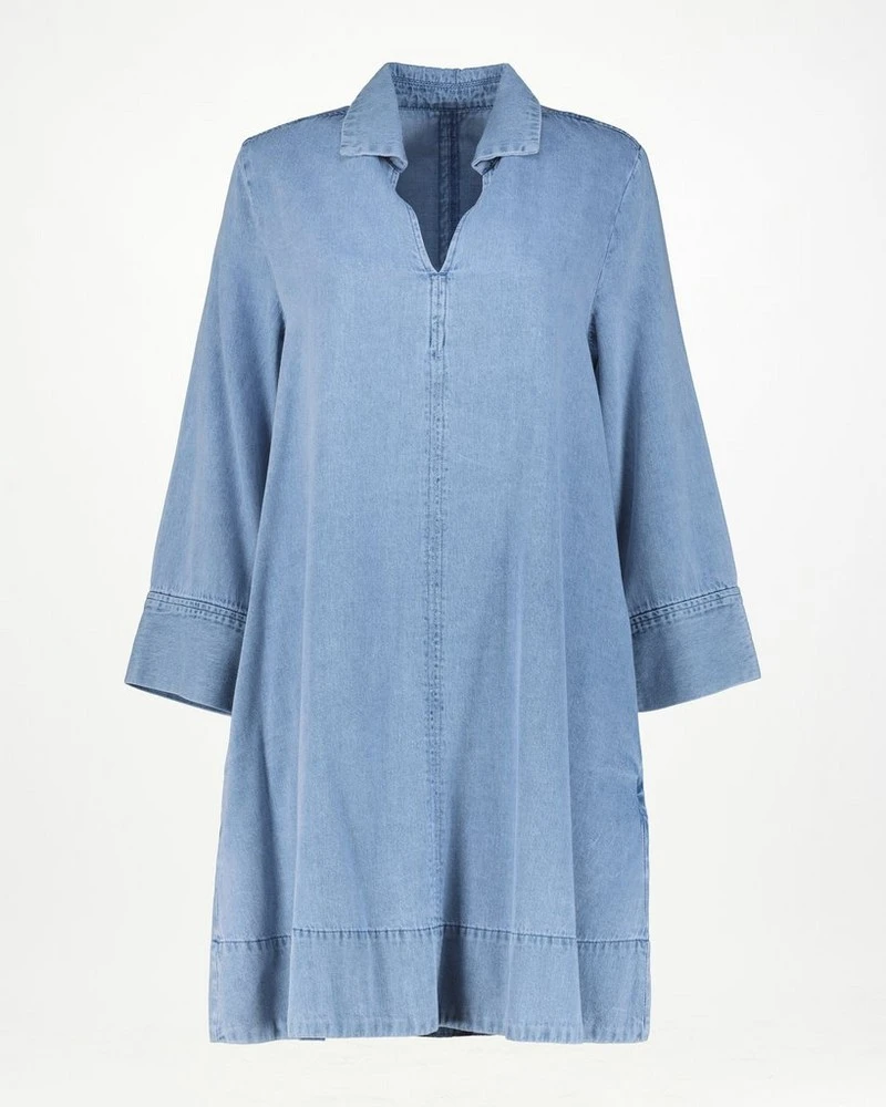 The Sasha Denim Dress is a whole look in one piece. Made from a comfortable cotton blend fabric, it sits just above the knee and the flowy silhouette allows for maximum comfort and style, with minimal effort.Â