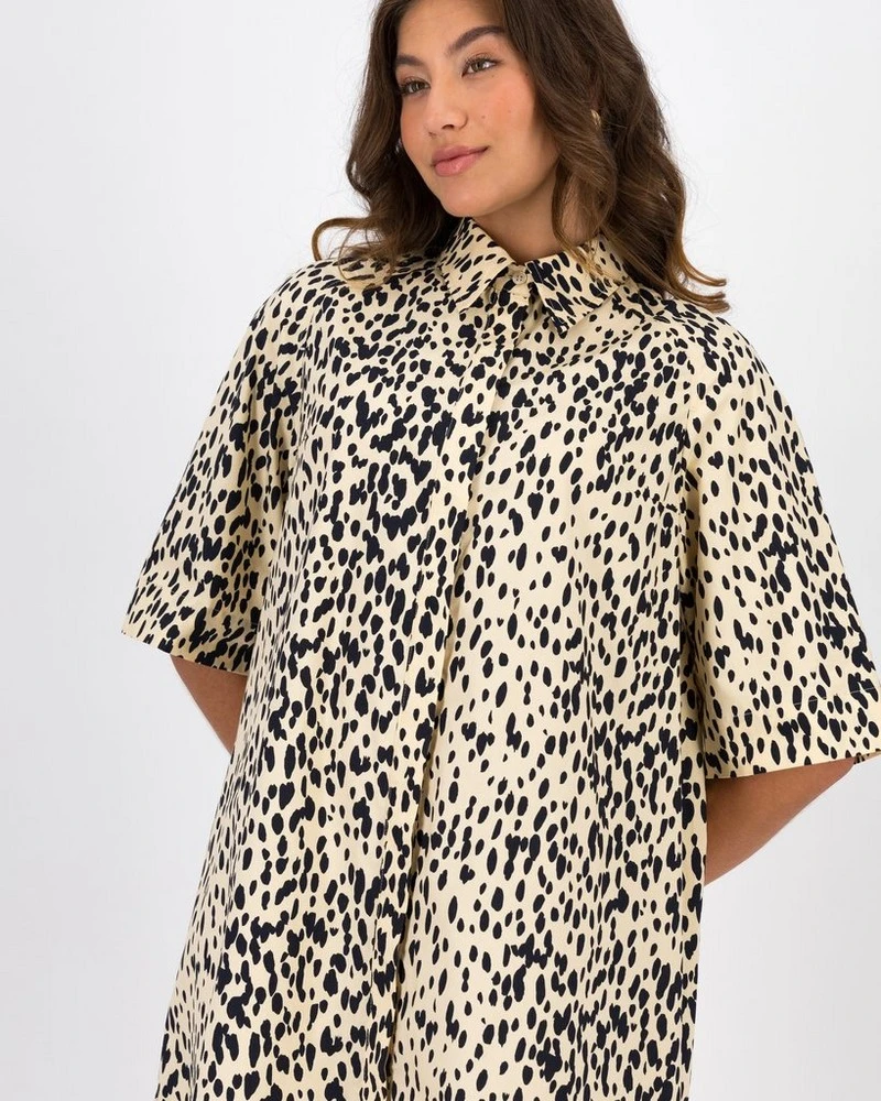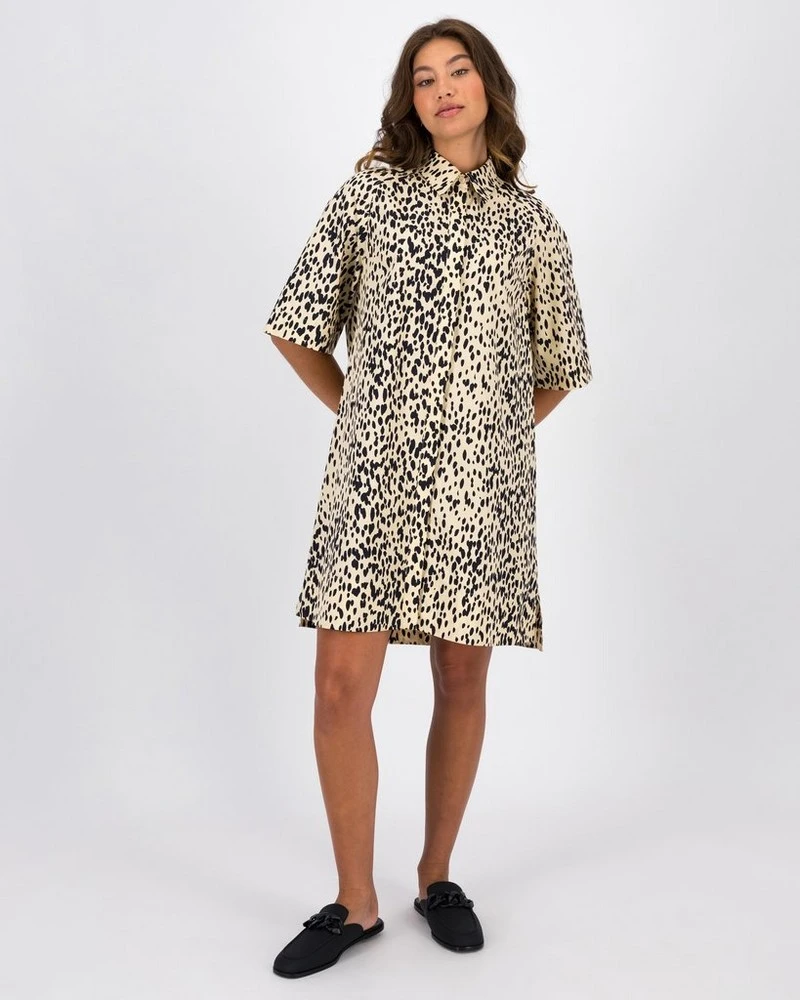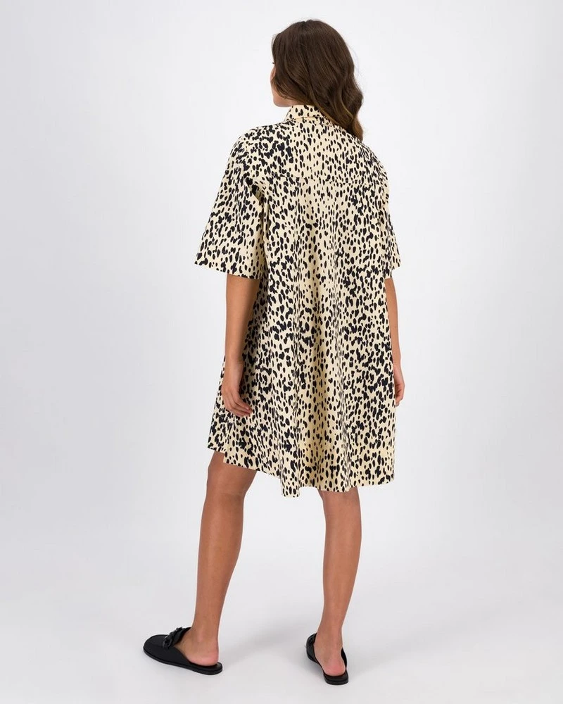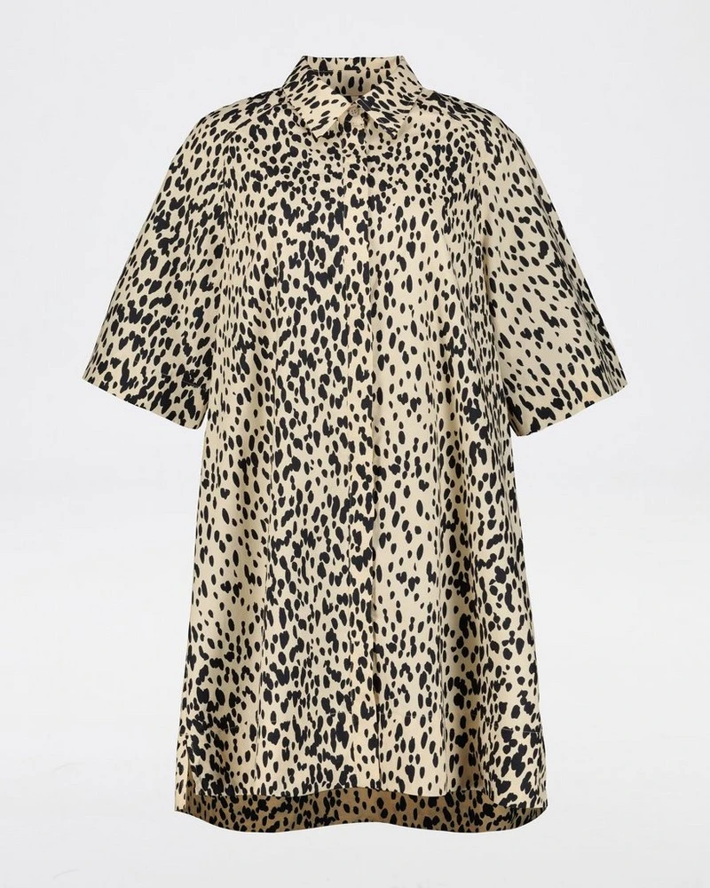 Embrace your wild side with the Sasha Trapeze Shirt Dress. Featuring a bold animal print, this locally made cotton poplin dress is easy to style and can be worn with sandals, sneakers or heels – the possibilities are endless with this one.