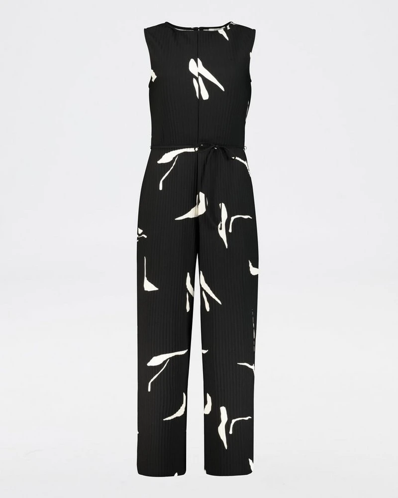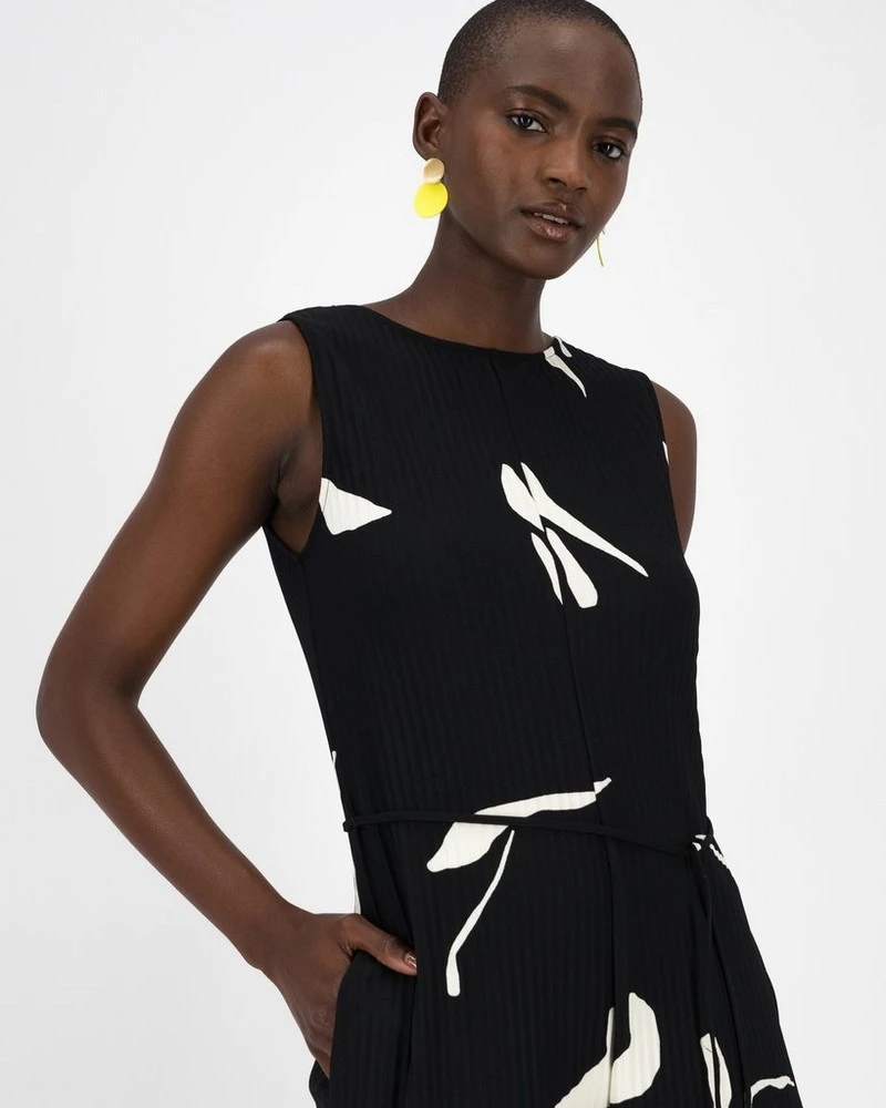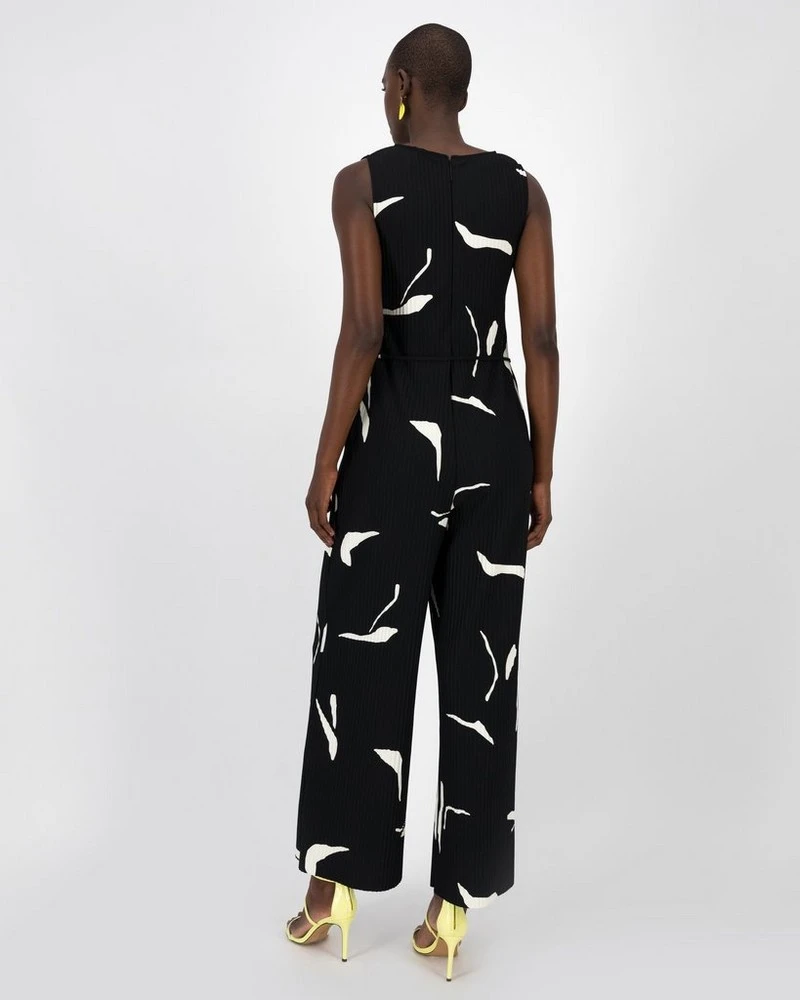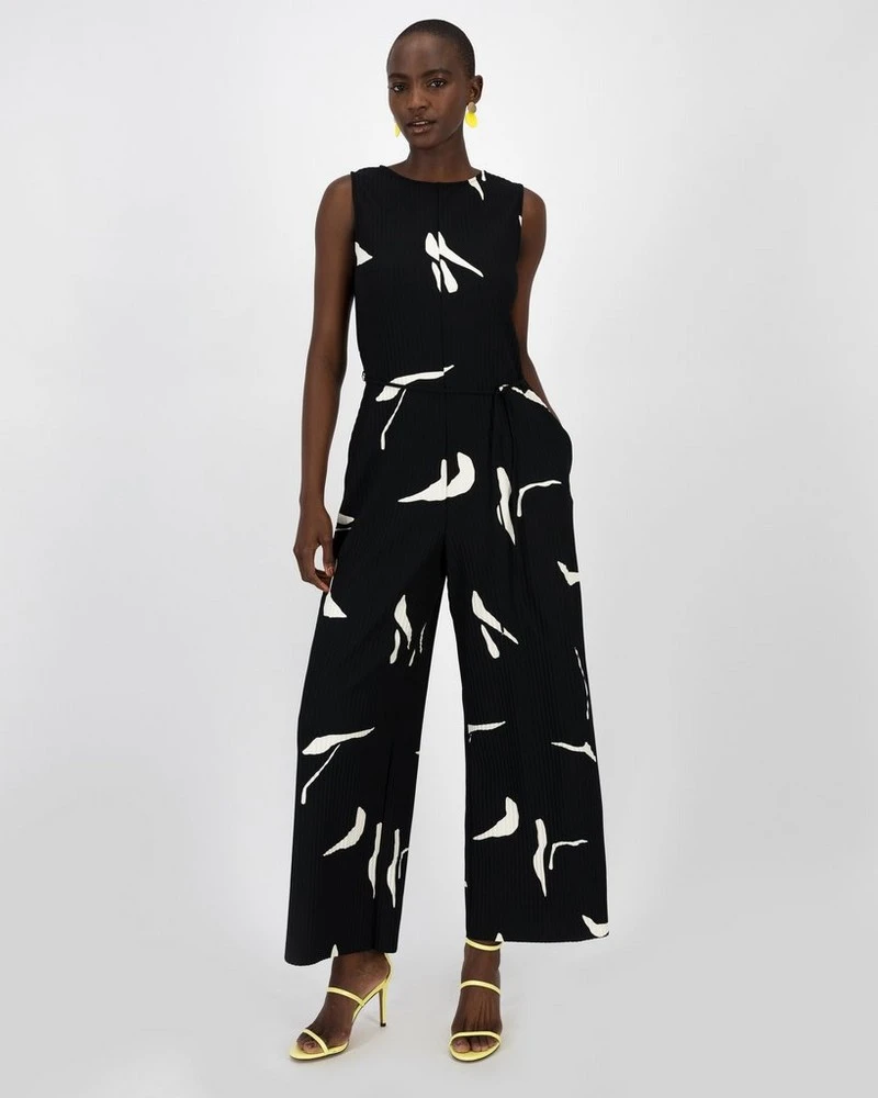 The Stephany Printed Plisse Jumpsuit is an elegant addition to any wardrobe. Adorned with painterly accents, the textured fabric adds dimension to your wardrobe. Pair with bright accessories to pull the look together.Â