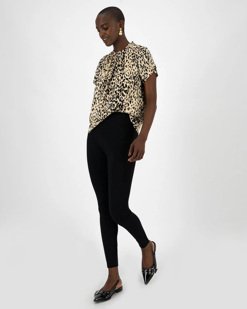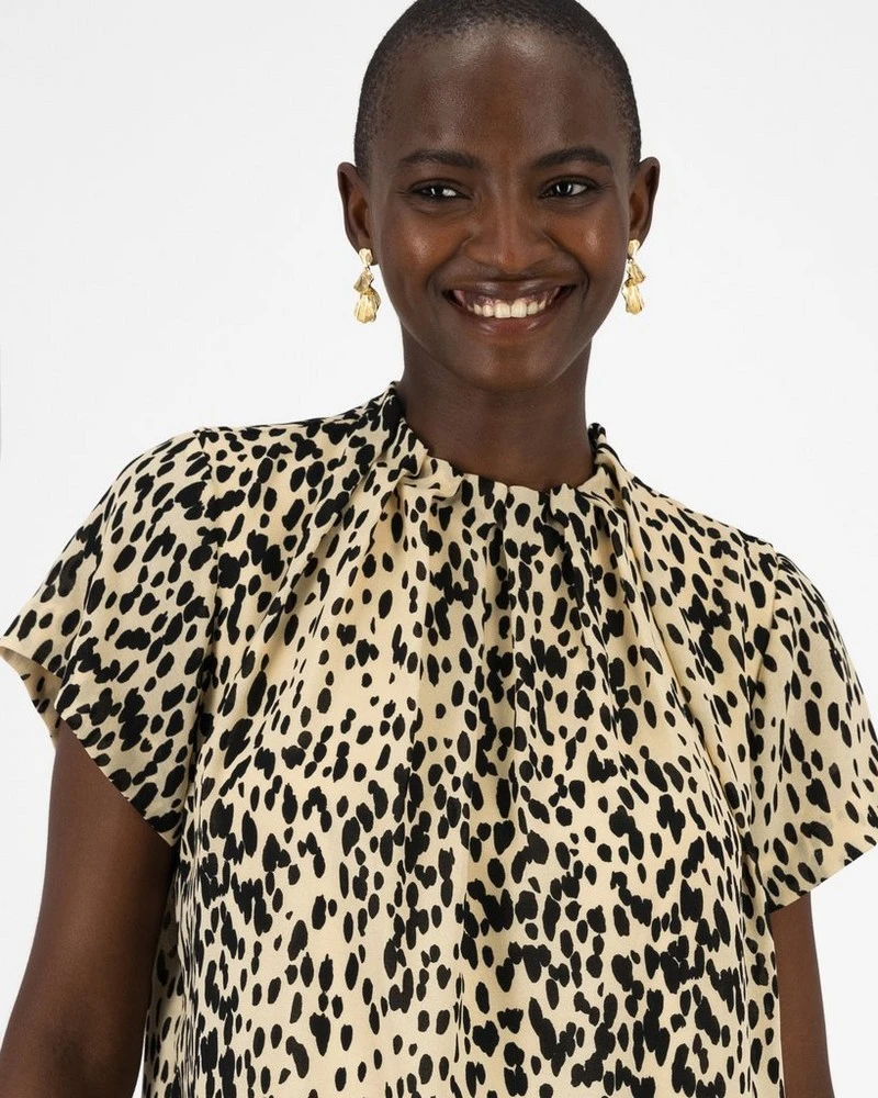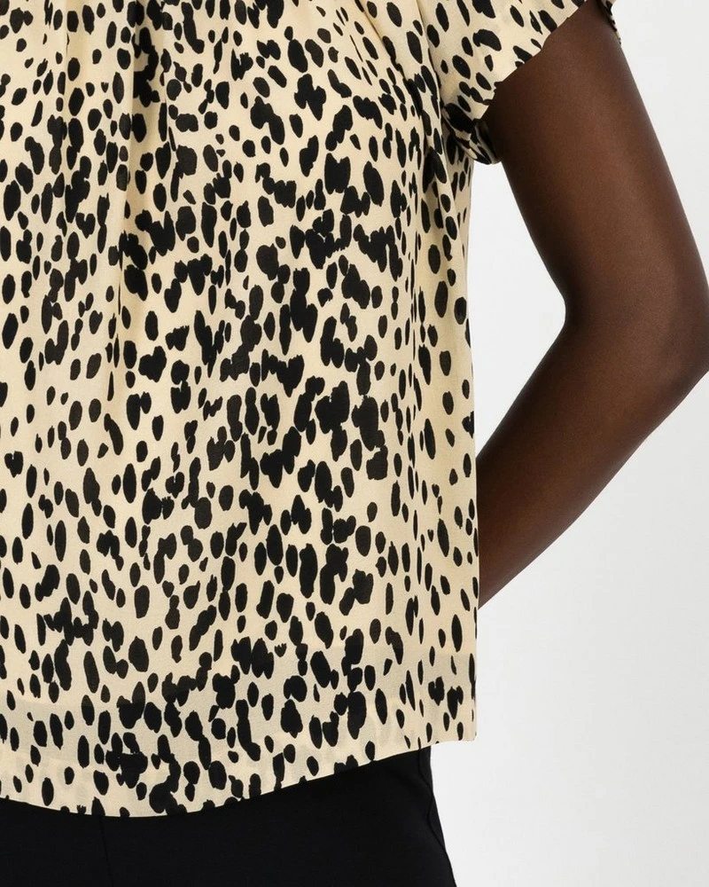 Stay stylish this summer with the Sylvie Short Sleeve Blouse. Modelled after our best-selling Sylvie Blouse, the top features soft pleats all around the neckline that creates a beautiful drape across the body, and an eye-catching animal print design. Wear with a slim-fit pants to give the blouse the spotlight it deserves.Â