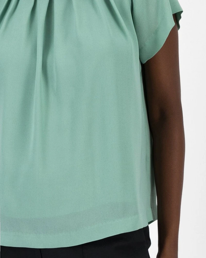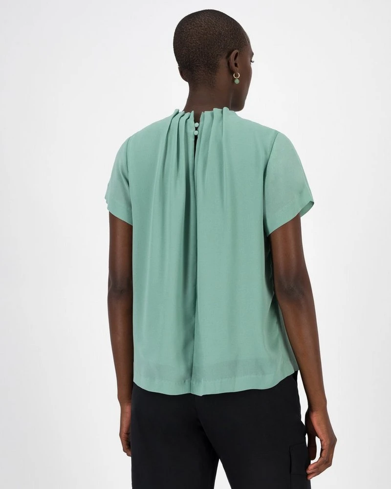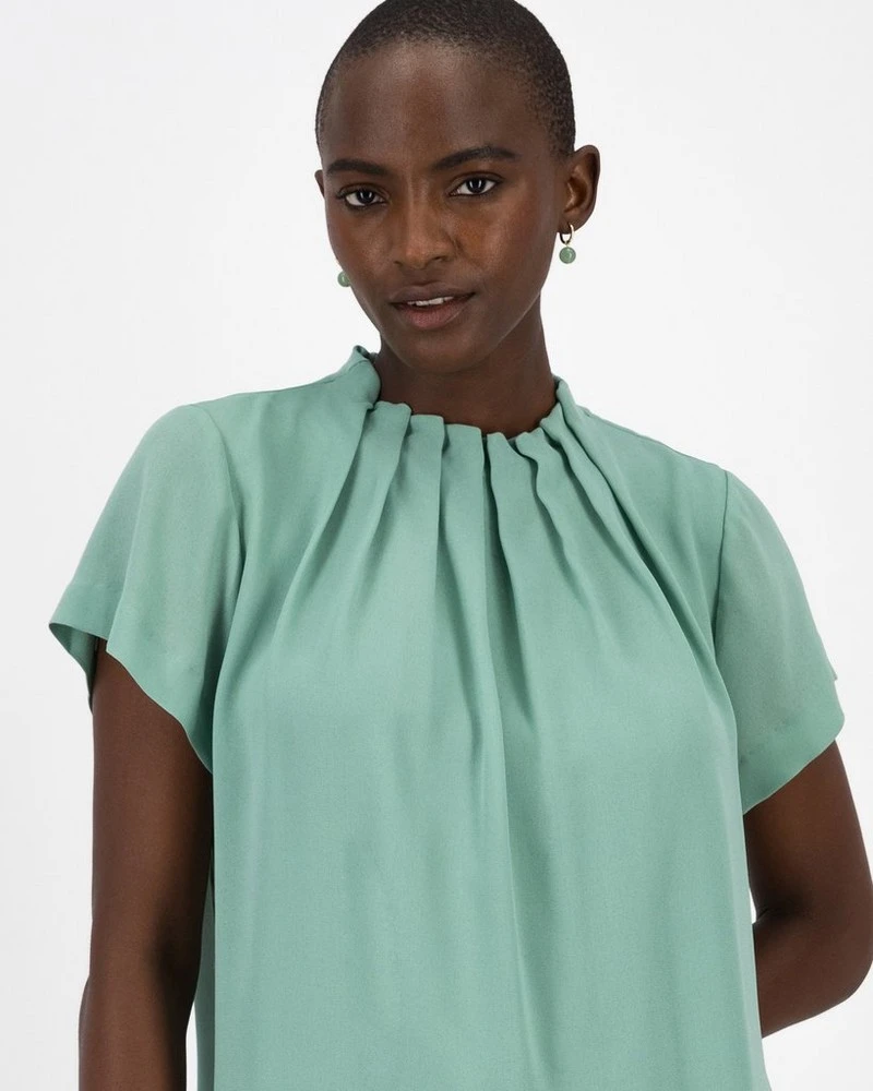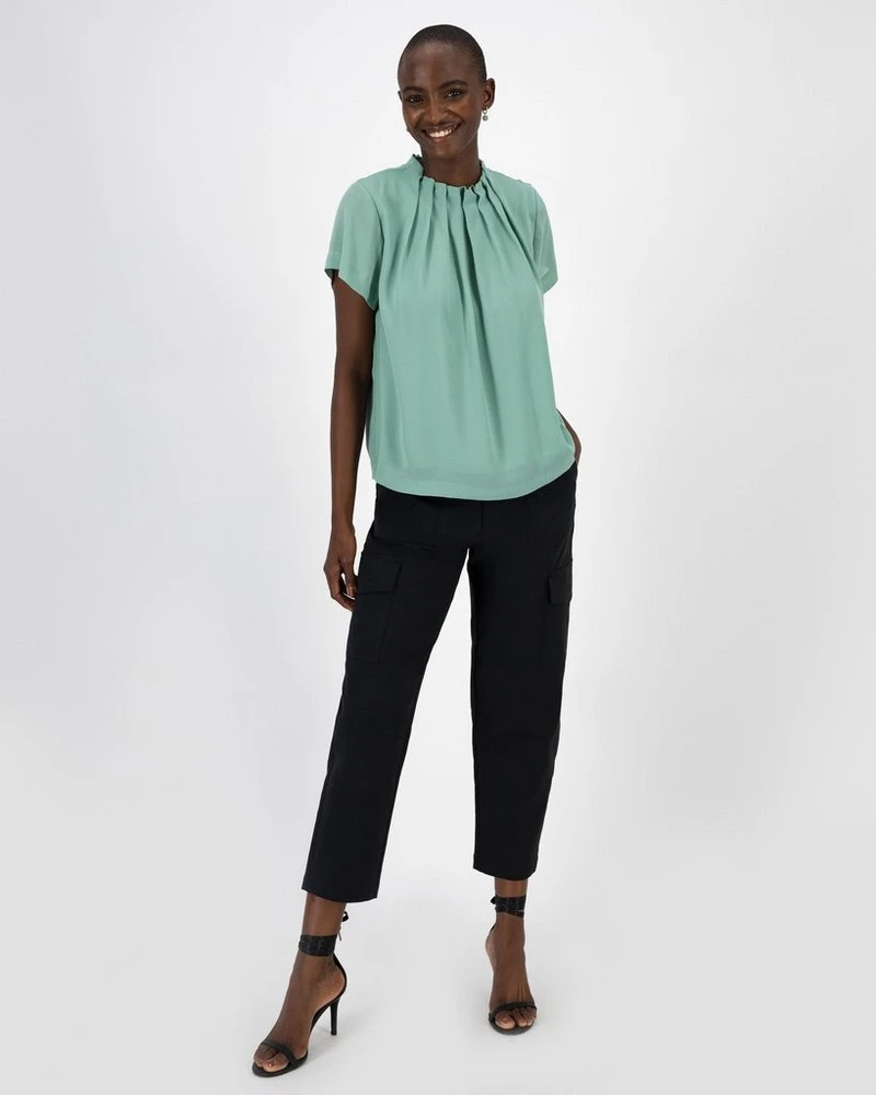 Stay stylish this summer with the Sylvie Short Sleeve Blouse. Modelled after our best-selling Sylvie Blouse, the top features soft pleats all around the neckline that creates a beautiful drape across the body. Wear with a slim-fit pants to give the blouse the spotlight it deserves.Â