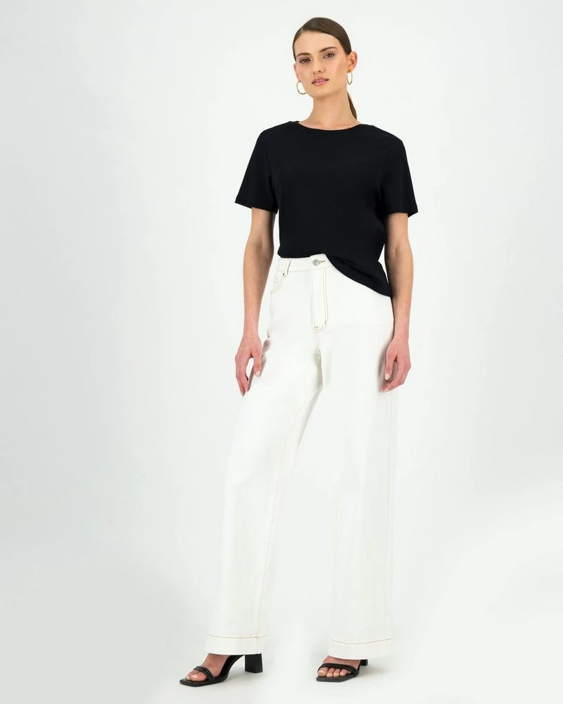 The classic white jean gets a subtle upgrade with the Tobie Topstitched White Denims. Contrast stitching adds delicate detail while the flattering full length flared leg makes this a versatile piece to add to your collection.Â