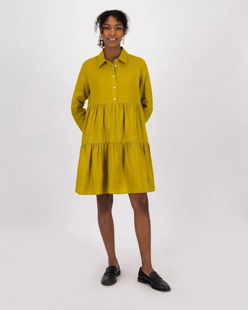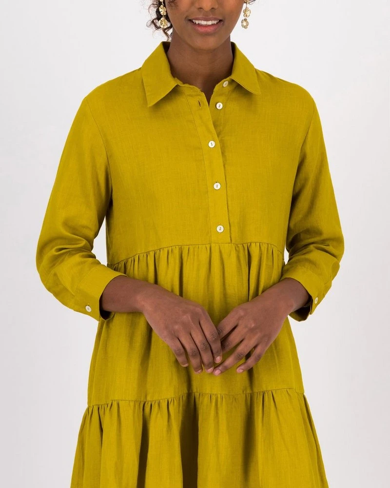 Comfortable, chic and versatile, the Tori Short Tiered Dress is a must-have for the season ahead. Locally made from 100% linen with cotton lining, the A-line dress features a collared neckline and quarter-length button-down with long sleeves and a flattering tiered skirt.