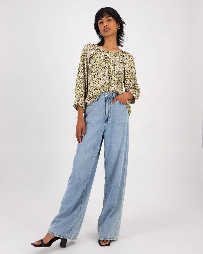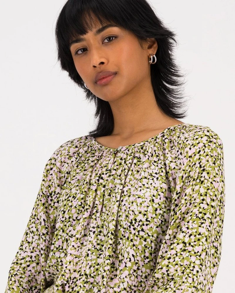 Flattering, flared and floral, the Triana Blouse can be dressed up or down. Locally made from a lightweight viscose rayon with a ditsy abstract print, it features a flared design with a rounded neckline, three-quarter sleeves and some gathering detail around the neck.