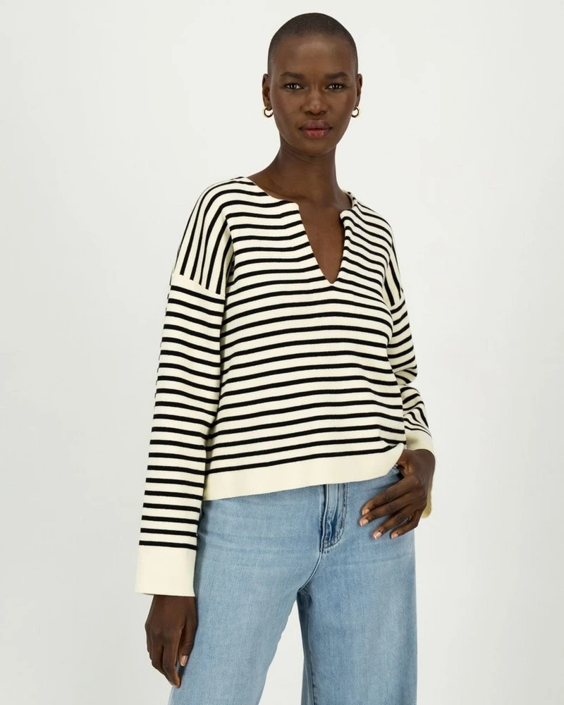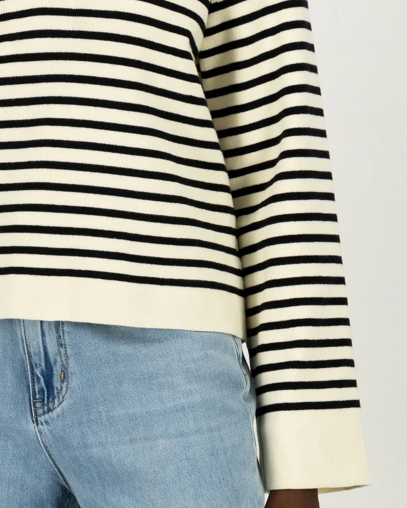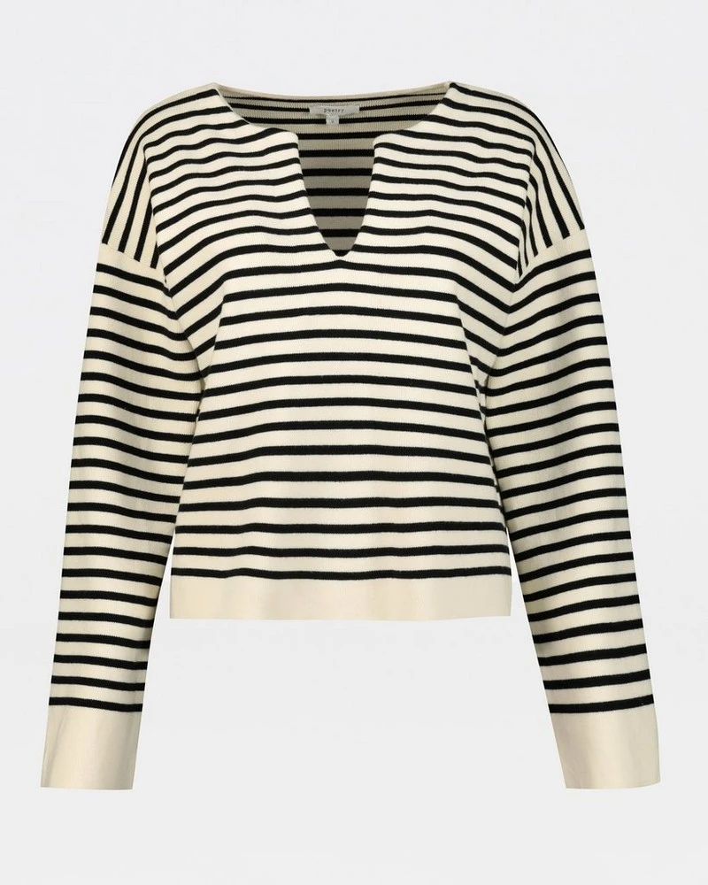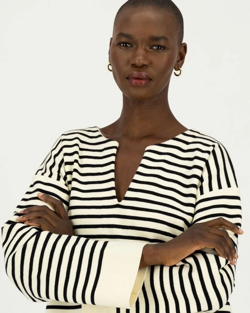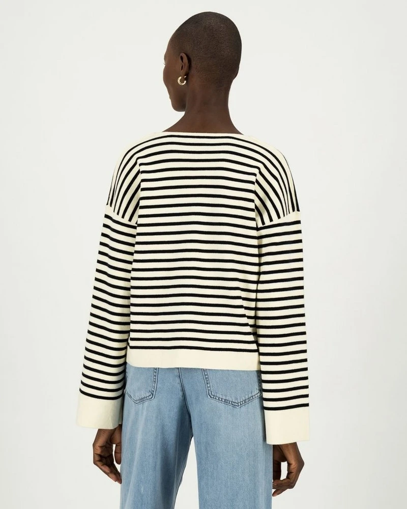 The Trixie Stripe Knit is a classic and comfortable capsule wardrobe essential. Our best-selling striped print is back in a new silhouette, creating the perfect relaxed look for a cooler summer evening. Made from sustainably-sourced cotton, the jersey features a relaxed look and feel with a v-neckline and long drop-shoulder sleeves.