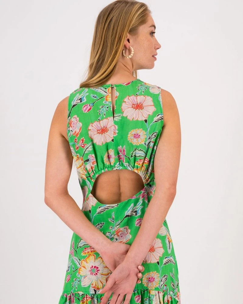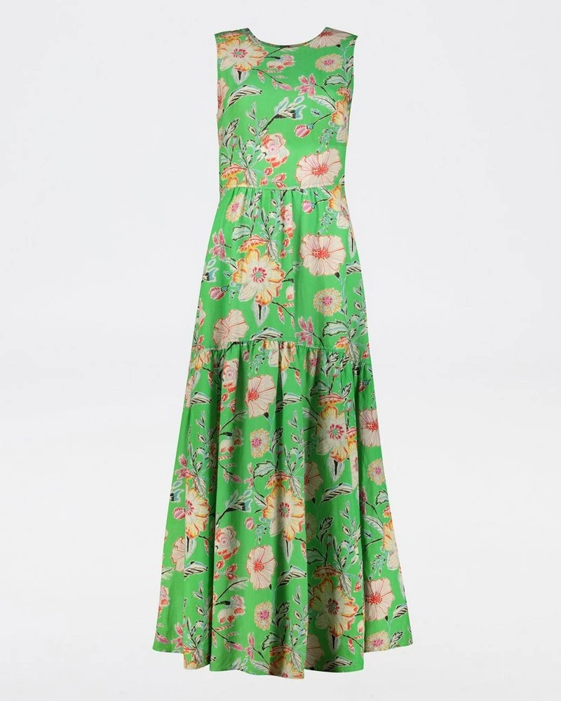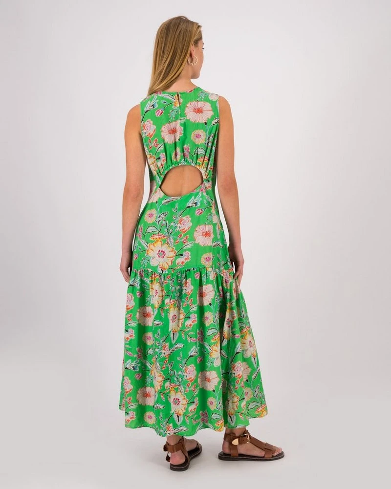 Add a pop of colour with the Veda Printed Dress. This stunning dress has a beautiful tiered skirt design, and an open back that lends a touch of femininity to the piece. The vibrant floral design featured throughout makes it ideal for the summer season.Â